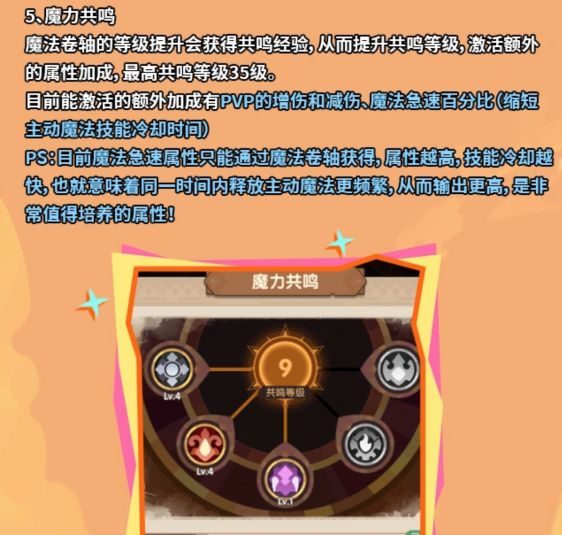 进阶玩法“魔力共鸣”进一步拓展了卷轴的成长深度。卷轴等级提升将自动积累共鸣经验,共鸣等级最高可达35级。每提升一级,均可解锁额外属性,包括PVP专属增伤/减伤加成,以及关键的“魔法急速百分比”。该属性直接缩短主动技能冷却时间,使单位时间内技能释放频次倍增,从而实现爆发输出密度与持续作战能力的双重跃升。