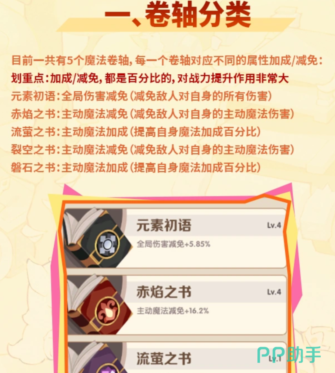 当前版本共开放五类核心魔法卷轴:元素初语、赤焰之书、流萤之书、裂空之书与磐石之书。所有属性增益均以百分比形式生效,直接作用于角色全局机制。其中,元素初语提供全伤害减免,是构筑容错率的底层保障;赤焰之书与裂空之书侧重降低敌方主动魔法伤害;流萤之书与磐石之书则分别强化我方主动魔法的伤害与效果稳定性。科学搭配不同卷轴组合,可实现攻防节奏的动态平衡,大幅提升关卡通关效率与PVP对抗韧性。