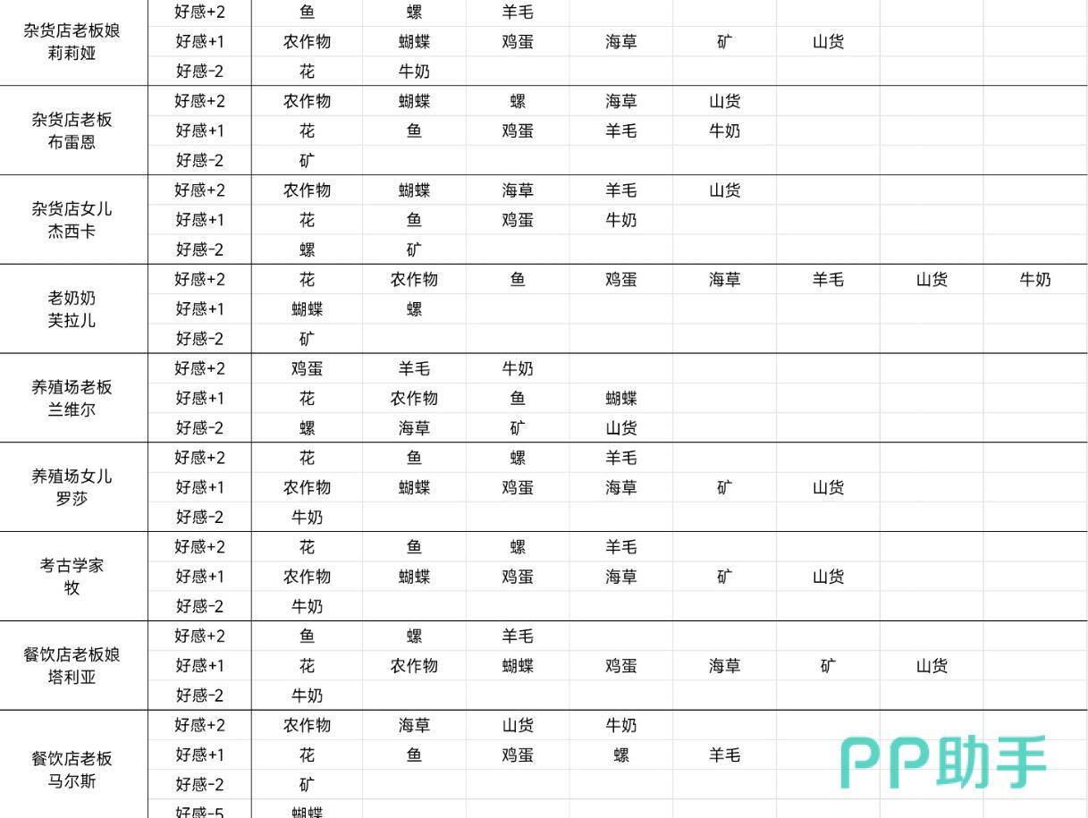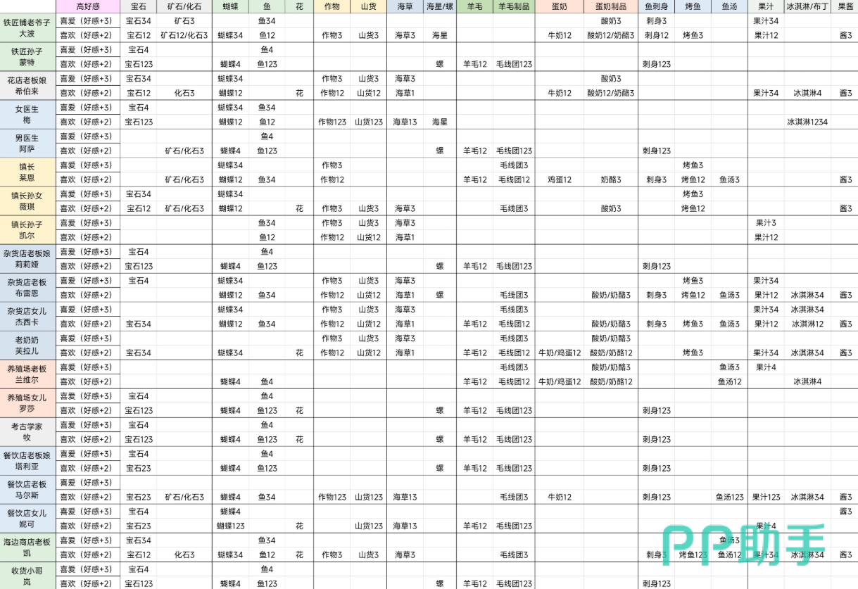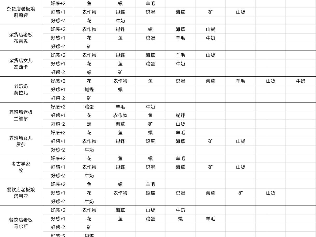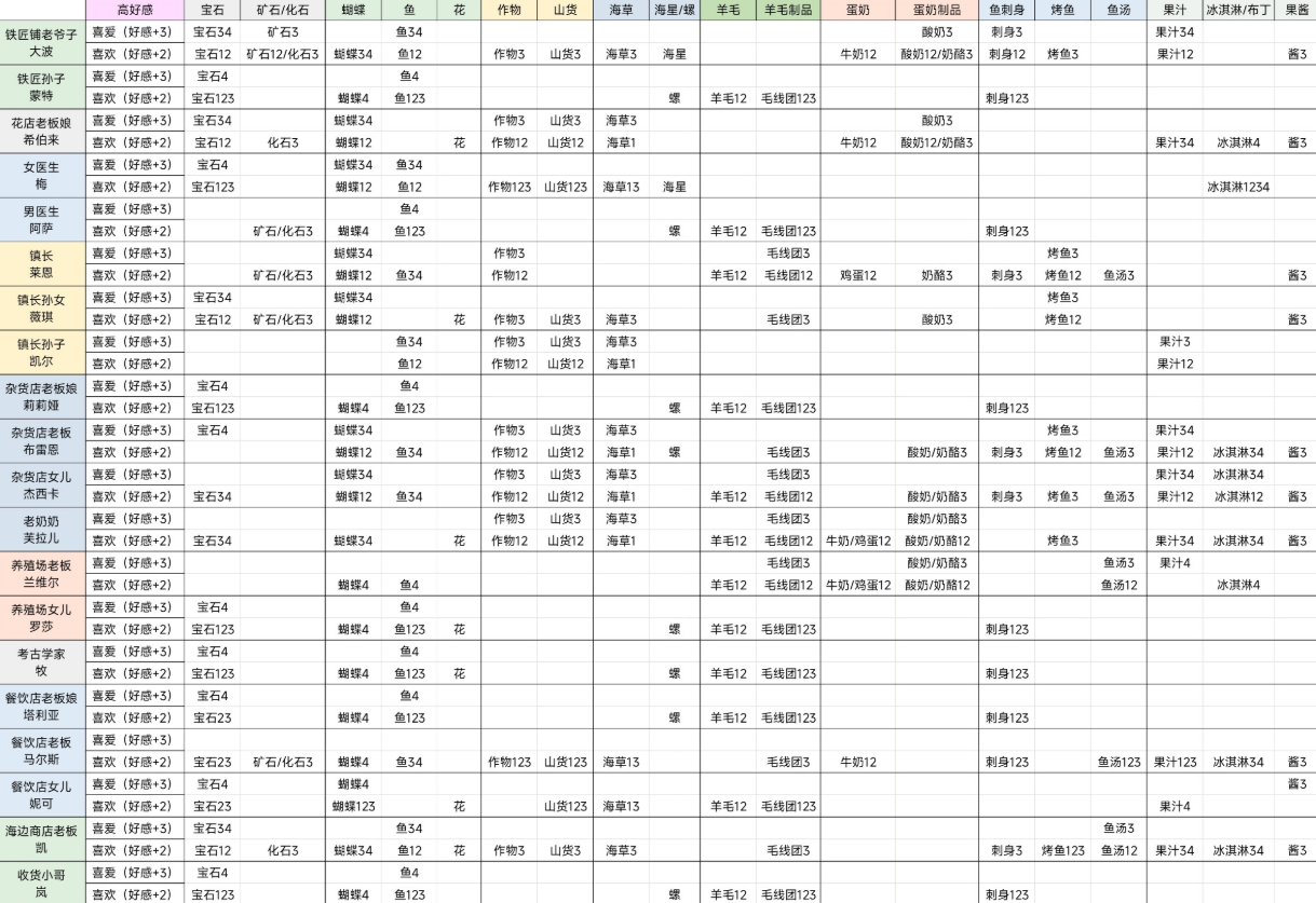 随着农场发展步入中期,材料储备逐渐充裕,应转向针对性更强的高价值馈赠。NPC好感度存在等级差异:普通喜爱类礼物加2点,特别喜爱类加3点。一次精准投送,等效于前期三次通用礼。无需死记硬背全部偏好,掌握核心规律即可事半功倍——例如铁匠家族偏爱宝石、高星鱼类及奶制品;花店店主则对蝴蝶、高星作物与山货反应积极。