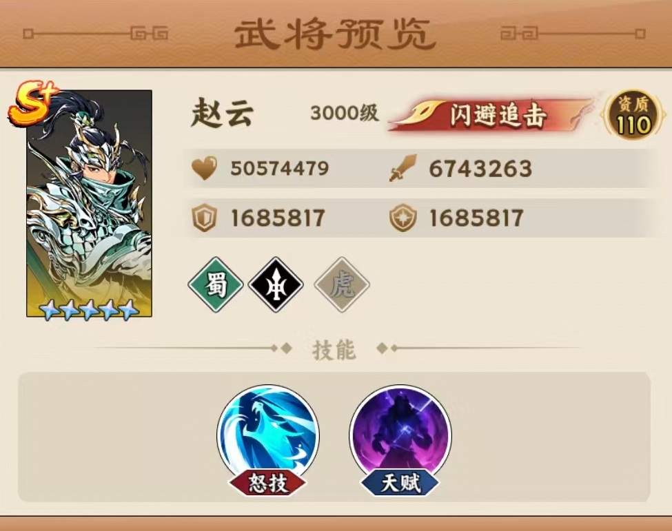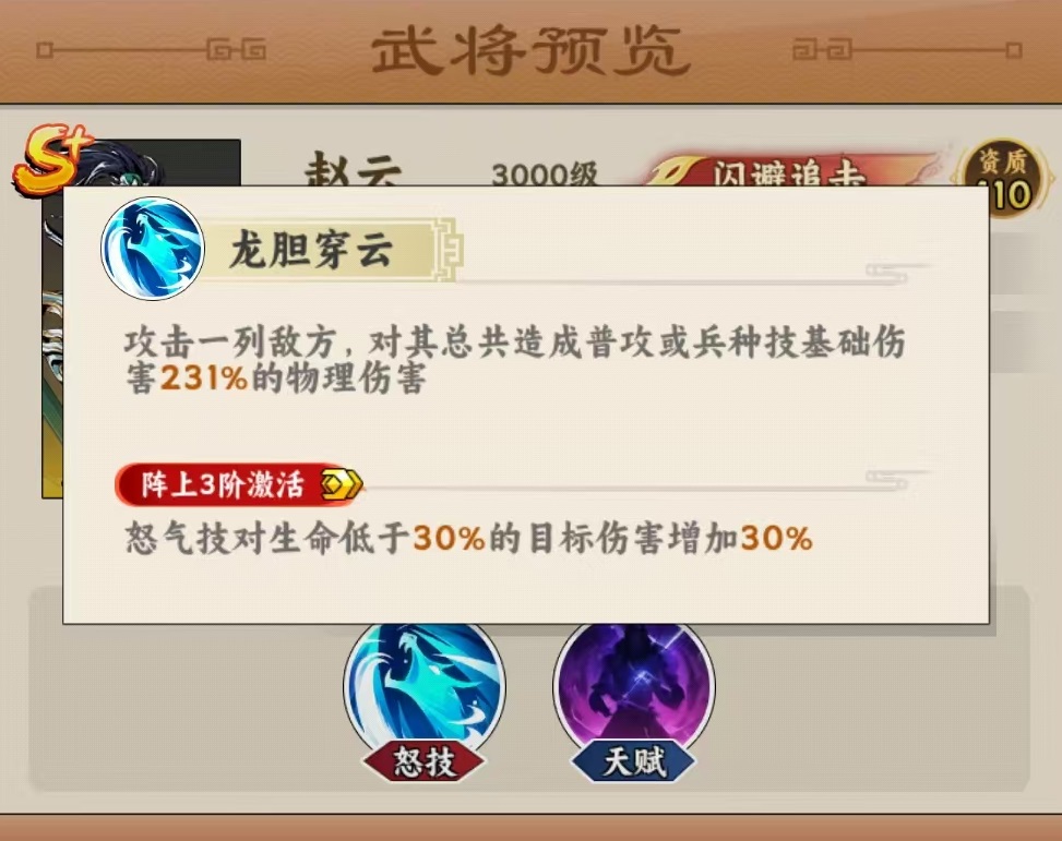 赵云的基础机制围绕“闪避—追击—收割”展开。其怒气技能【龙胆穿云】可对一列敌人造成231%普攻或兵种技基础伤害;当目标生命值低于30%时,额外提升30%伤害,显著强化残局终结效率。天赋体系逐阶解锁关键能力:五星阶段实现“受主动攻击即触发追击”,造成80%攻击力的物理伤害;九星阶段提升闪避率,并赋予闪避成功后概率追击的效果;英杰一星起,每次行动后获得两层【七出】状态,持续增强闪避属性;无双阶段则引入动态增益机制——使用怒气技能击杀敌方单位时,叠加最多三层伤害加成;若未达成击杀,则转为叠加最高五层闪避增益。