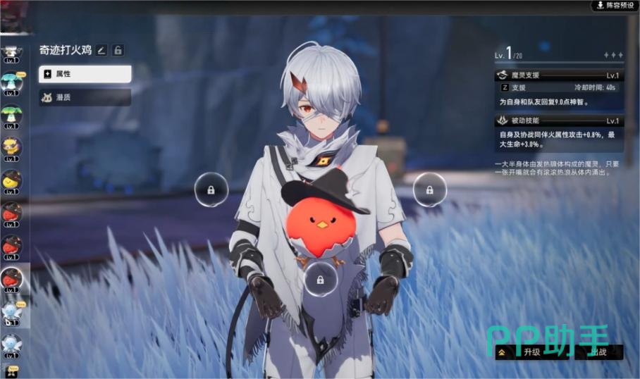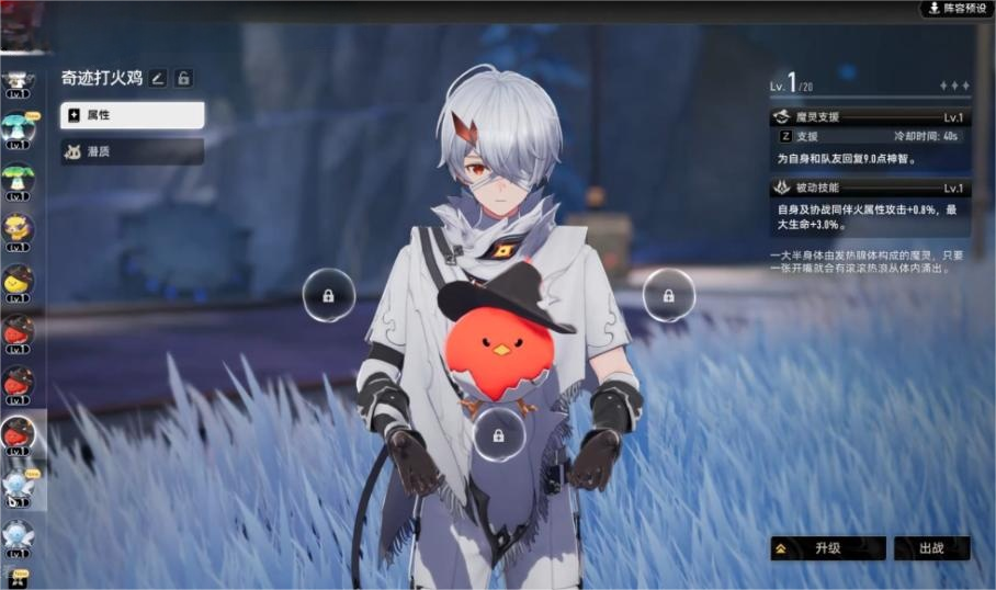 打火鸡具备多种词条组合,每种词缀都会影响其属性加成和支援能力。该魔灵支持三件装备装配,不仅能增强角色基础数值,还可激活特定技能效果。以锐意打火鸡为例,其提供的魔灵支援可为自身及队友恢复9.0点神智值,被动技能则提升自身与协战单位0.8%的火属性攻击力,并增加3%最大生命值,在团队作战中表现尤为出色。
