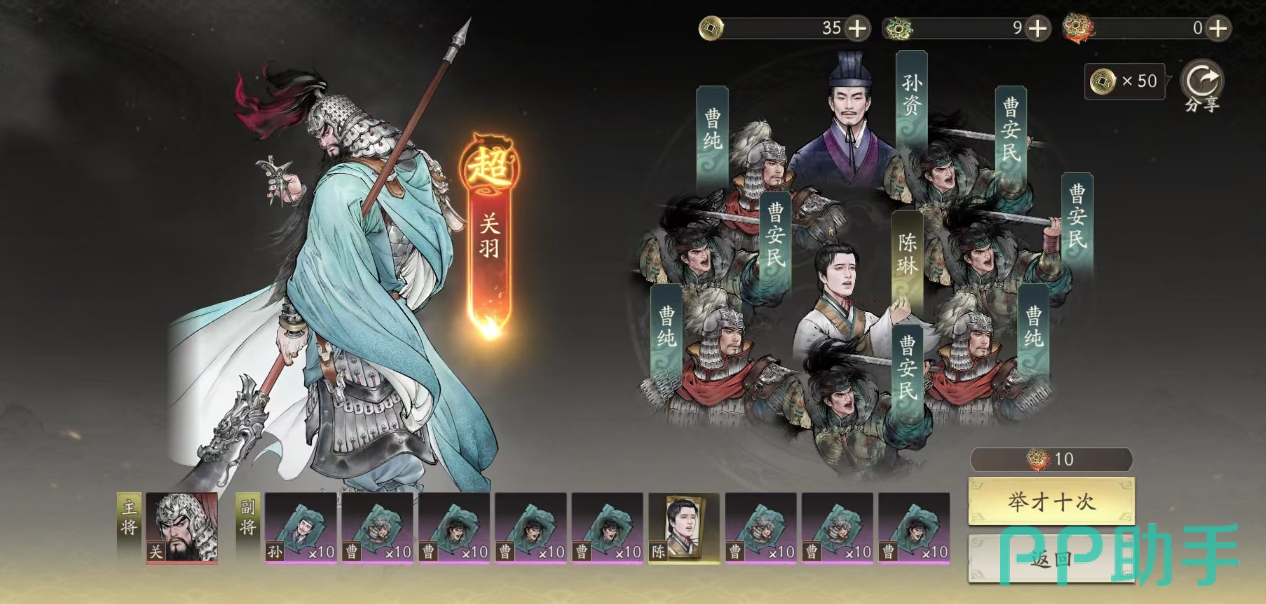 游戏开服初期会同步开启两个卡池:新手池与自选池。建议所有玩家优先完成新手池的全部抽取次数。该卡池提供限时折扣福利,10连抽享受八折优惠,总共50次抽取仅需消耗40个举才玉即可完成。更重要的是,新手池保底必出一名SSR级别武将,这类角色在属性成长、技能强度方面均优于普通单位,能显著加快阵容成型速度。一旦错过此阶段,新手池将永久关闭,因此务必尽早集齐材料并一次性抽完。