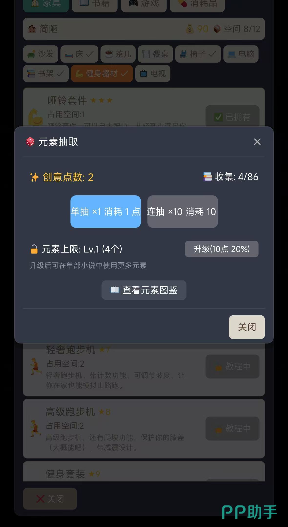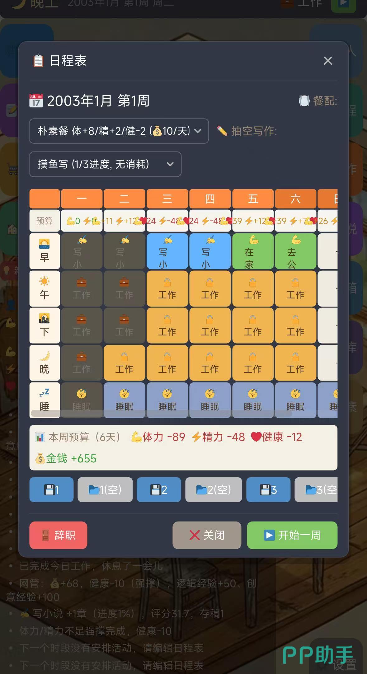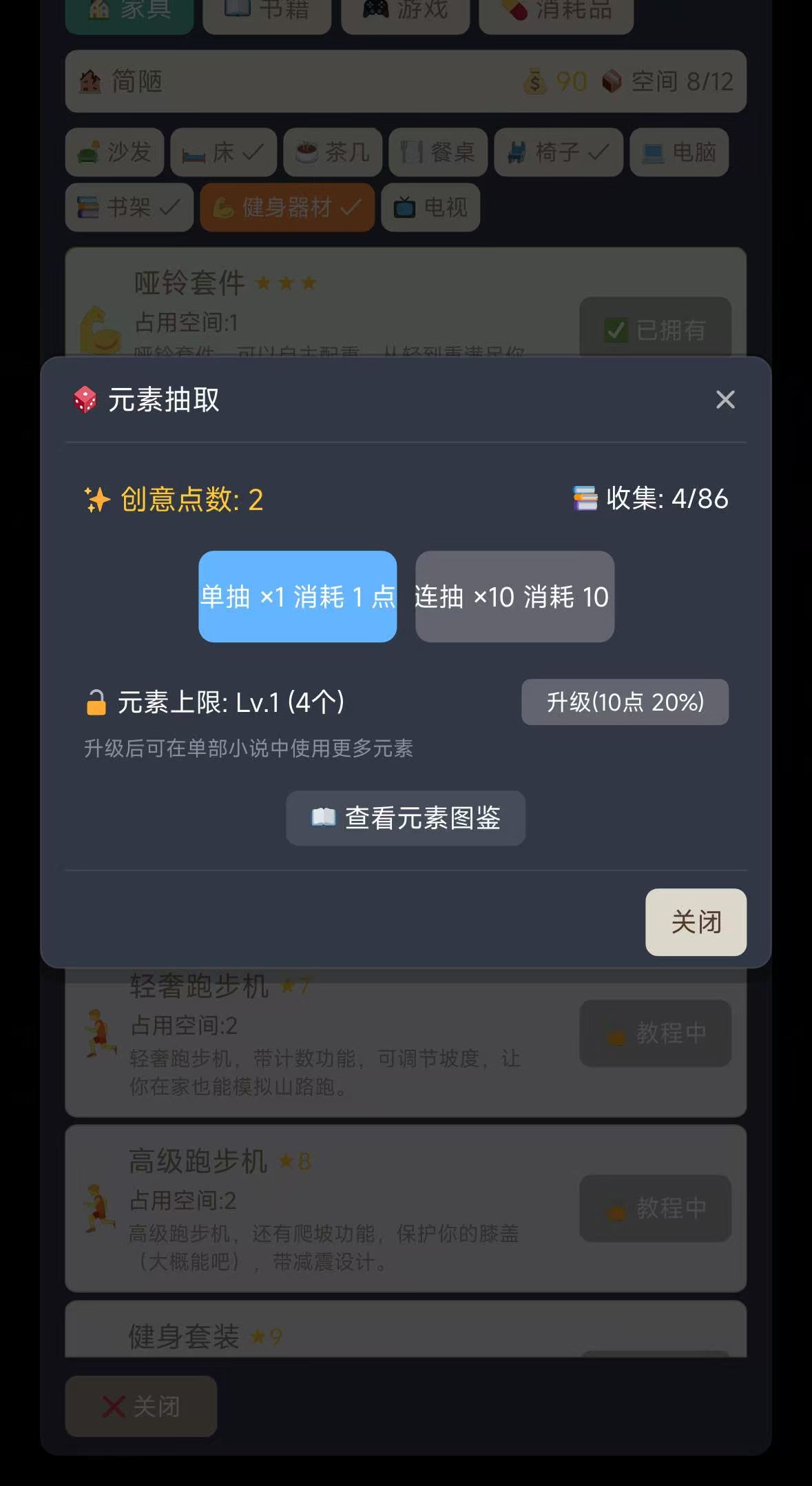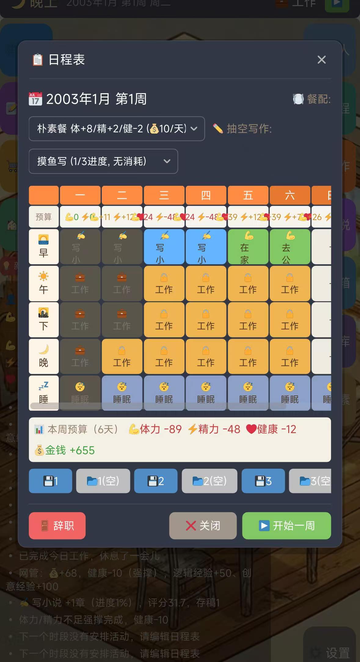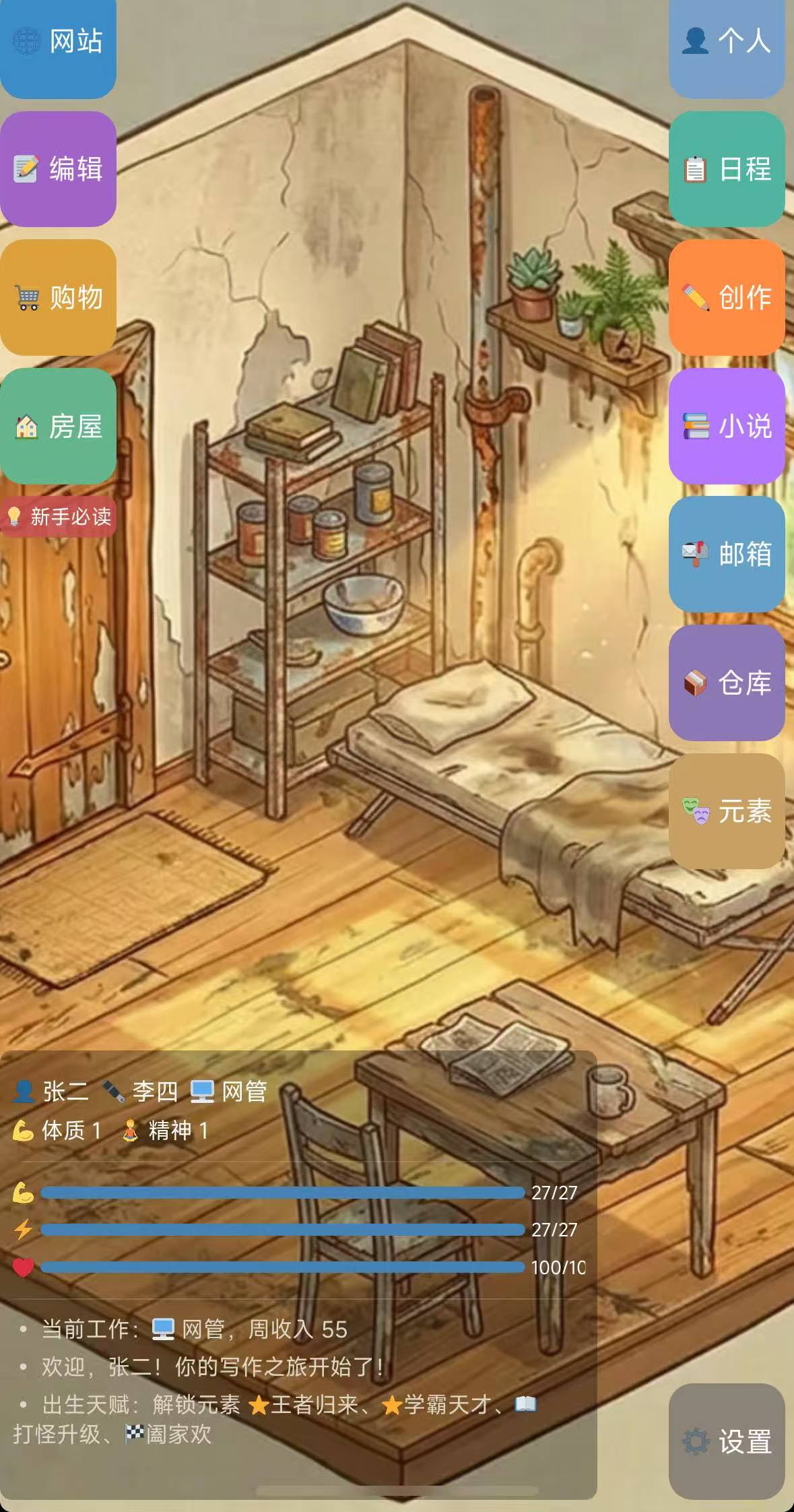 小说创作流程高度拟真:玩家需自主拟定书名、撰写大纲、规划章节体量与更新频率。创意点数可用于抽取“元素卡”,涵盖人设模板、世界观架构、情节爆点等关键素材,元素收集越丰富,作品完成度与读者黏性越高。前期成长依赖多维属性建设——跑步与健身可拓展体质上限,购书与策略类游戏能增强精神储备,二者共同支撑高强度连载所需的持续输出能力。