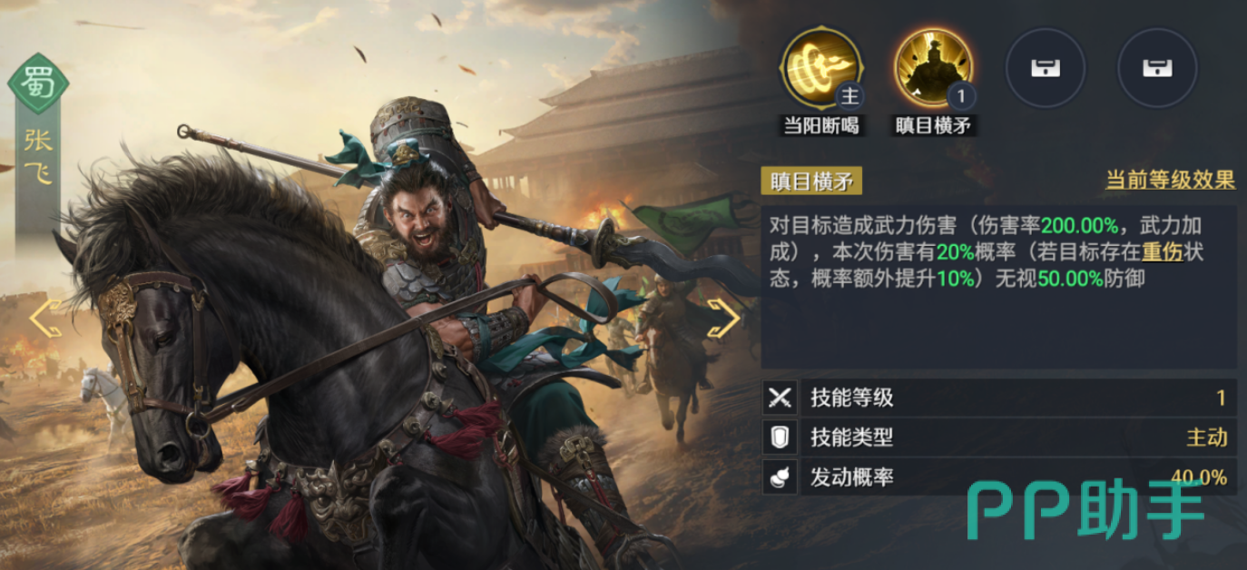 站位策略在实战中具有显著影响,典型例子便是签到获得的武将张飞。其自带技能“瞋目横矛”要求目标处于重伤状态才能触发额外增伤效果。为了确保该效果稳定生效,必须安排其他单位在张飞出手前施加重伤状态。由于战斗判定顺序为主将→副将1号→副将2号(即从左至右),因此将张飞置于副将2号位最为理想。这样可确保在他行动时,敌方已被队友挂上重伤,从而最大化输出能力。