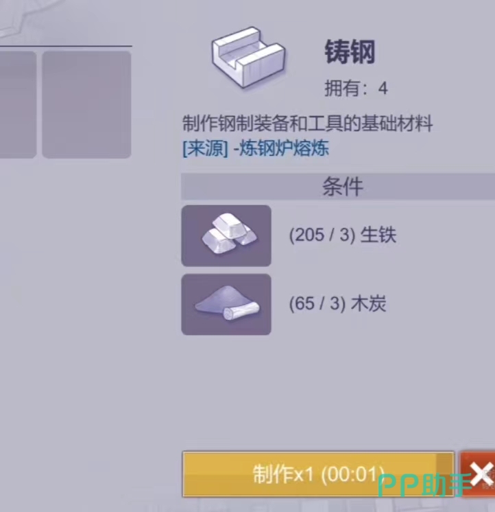 然后可以进行铸钢,铸钢在游戏后续可以作为制作钢制装备和工具的基础材料,是一类关键性建筑材料。