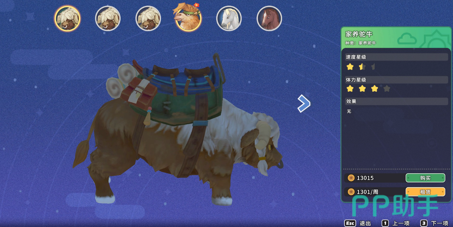 当前版本中,《沙石镇时光》共开放三种基础坐骑:骆驼、马、家养驼牛。三者属性呈明确三角关系——家养驼牛移速最慢,但体力值最高,负重上限显著优于其余两者;骆驼为均衡型选择,速度与耐力处于中间档位;马则拥有全游戏最高移速,代价是体力储备最低。值得注意的是,骆驼虽存在,但在主流玩法中使用率偏低,当前活跃玩家群体实际聚焦于马与家养驼牛的策略搭配。
