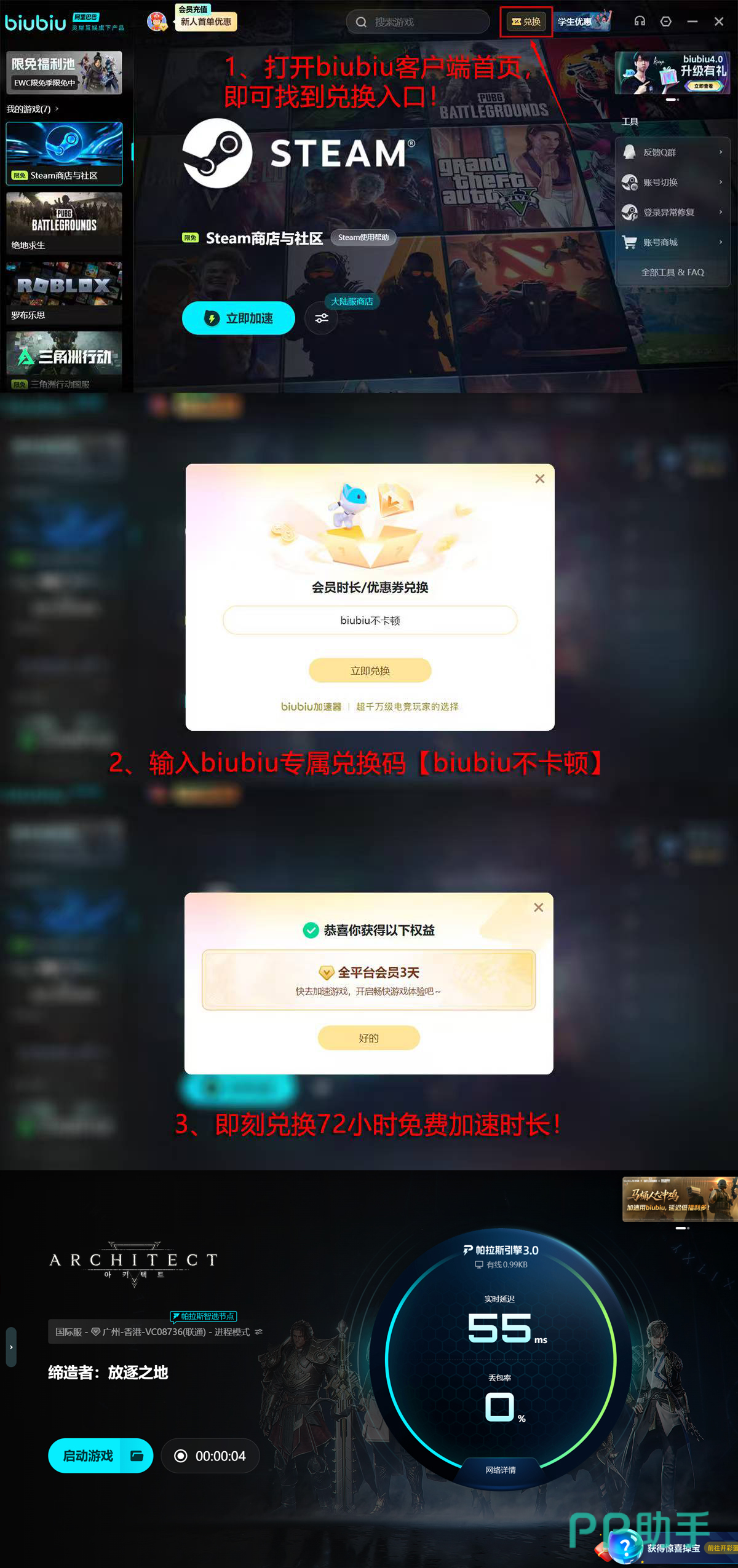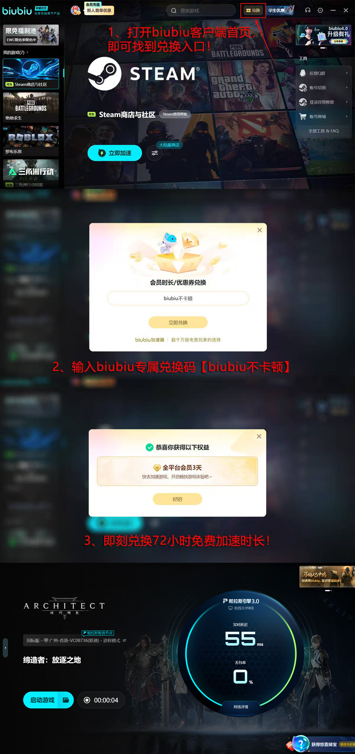 值得一提的是,为了提升产品体验,biubiu加速器特别邀请职业电竞选手左梓轩担任产品体验官,从实际操作角度提出改进建议,助力功能迭代升级。新用户现可通过输入【biubiu不卡顿】兑换3天免费加速时长,注册后还可额外领取24小时试用权限,总计可达96小时,适合用于公测期间的稳定连接保障。