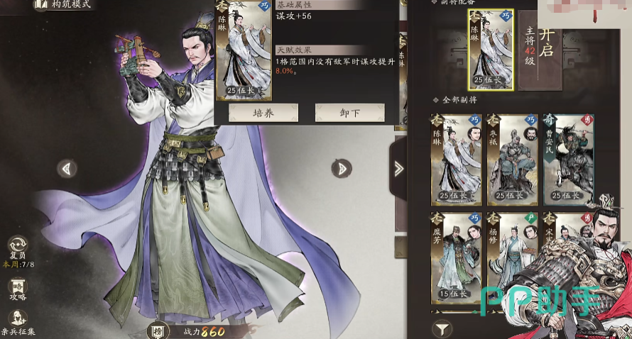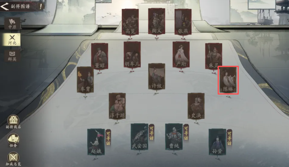 对于前期资源有限的玩家来说,将陈琳与刘晔搭配是一种性价比不错的过渡选择。若计划长期培养副将体系,则建议优先考虑超品质级别的角色以获取更强力的综合加成。需要注意的是,玩家需先在副将图鉴系统中点亮陈琳的角色头像,方可将其编入阵容,通常在角色等级达到25级时便可进入副将列表进行选取。
