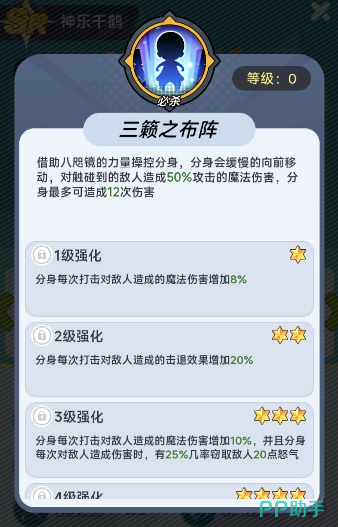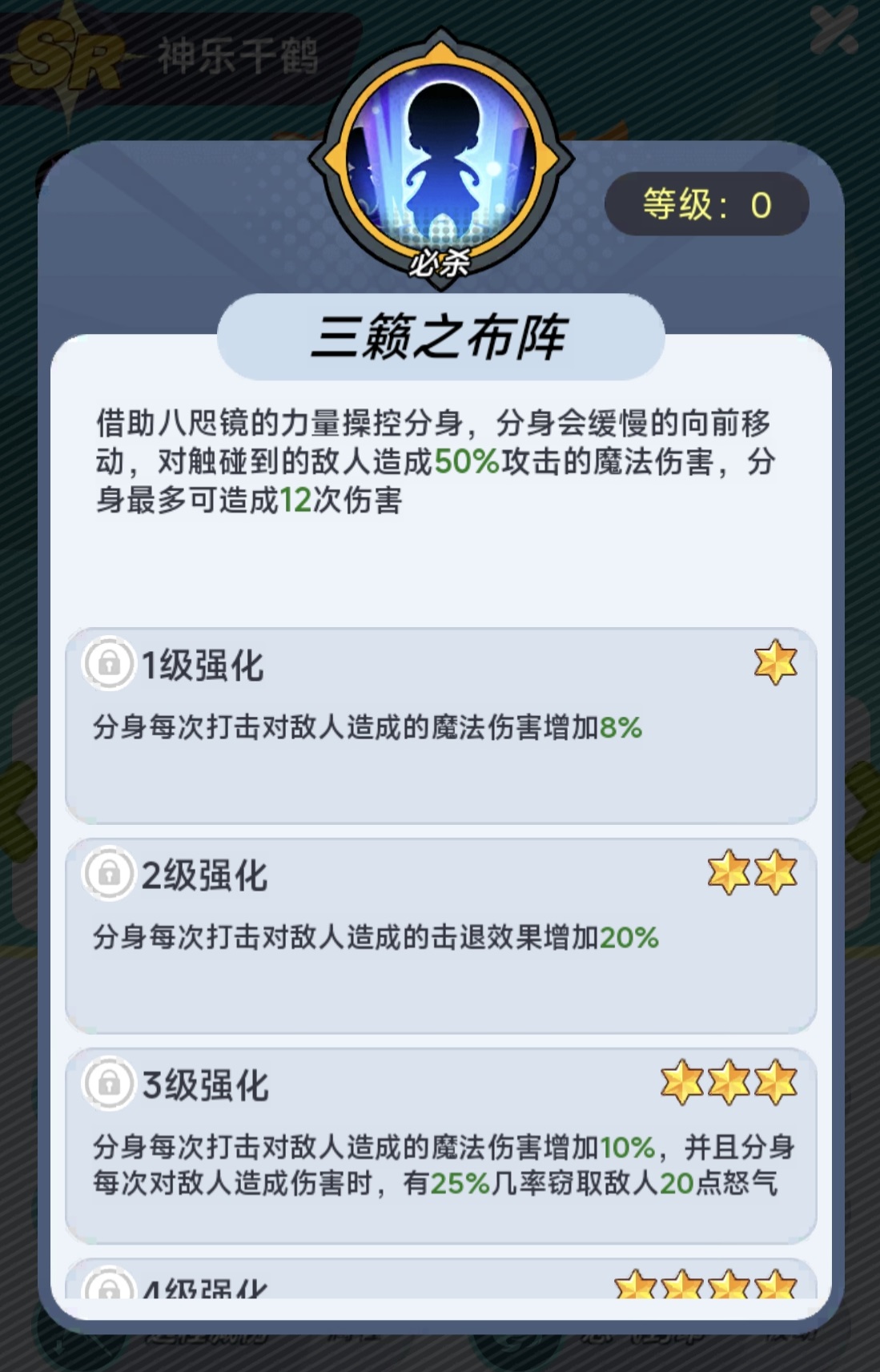 神乐千鹤的核心输出手段为必杀技“分身操控”,释放后生成可控分身沿直线缓速推进,接触敌人即触发魔法伤害。升星后,该分身每次命中均提升基础伤害,并附加击退效果;若同一目标累计被击中达4次,则强制施加1.5秒沉默状态,显著限制敌方关键技能释放节奏。