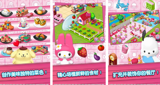 在这款以Hello Kitty为主题的小游戏里,融入了有趣的经营模拟玩法。大家可以亲自参与到美食制作环节中,尽情发挥厨艺,制作出各式各样的美味,像精致的甜品、可口的寿司等,充分照顾到不同客人的口味需求。游戏还贴心地设计了种菜收菜模式,大家可以搭建属于自己的农场,种上各类食材,保证食材新鲜又健康。此外,还能发挥创意,用丰富的装饰品打造个性化餐厅,营造专属的美食小镇氛围。