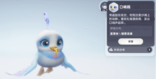 野外刷新点分布明确:鸥鸣湾沿岸是低等级玩家首选,常见15–25级口哨鸥,飞行高度较低,易于锁定;新叶台地刷新频率较高,但伴随星乐蒂与小炭犬出没,建议角色等级达36级后再前往以确保战斗容错率;星落林海滩存在异色个体,通体蓝白配色,技能特效更鲜明,不过出现概率低于常规个体,需耐心守候。