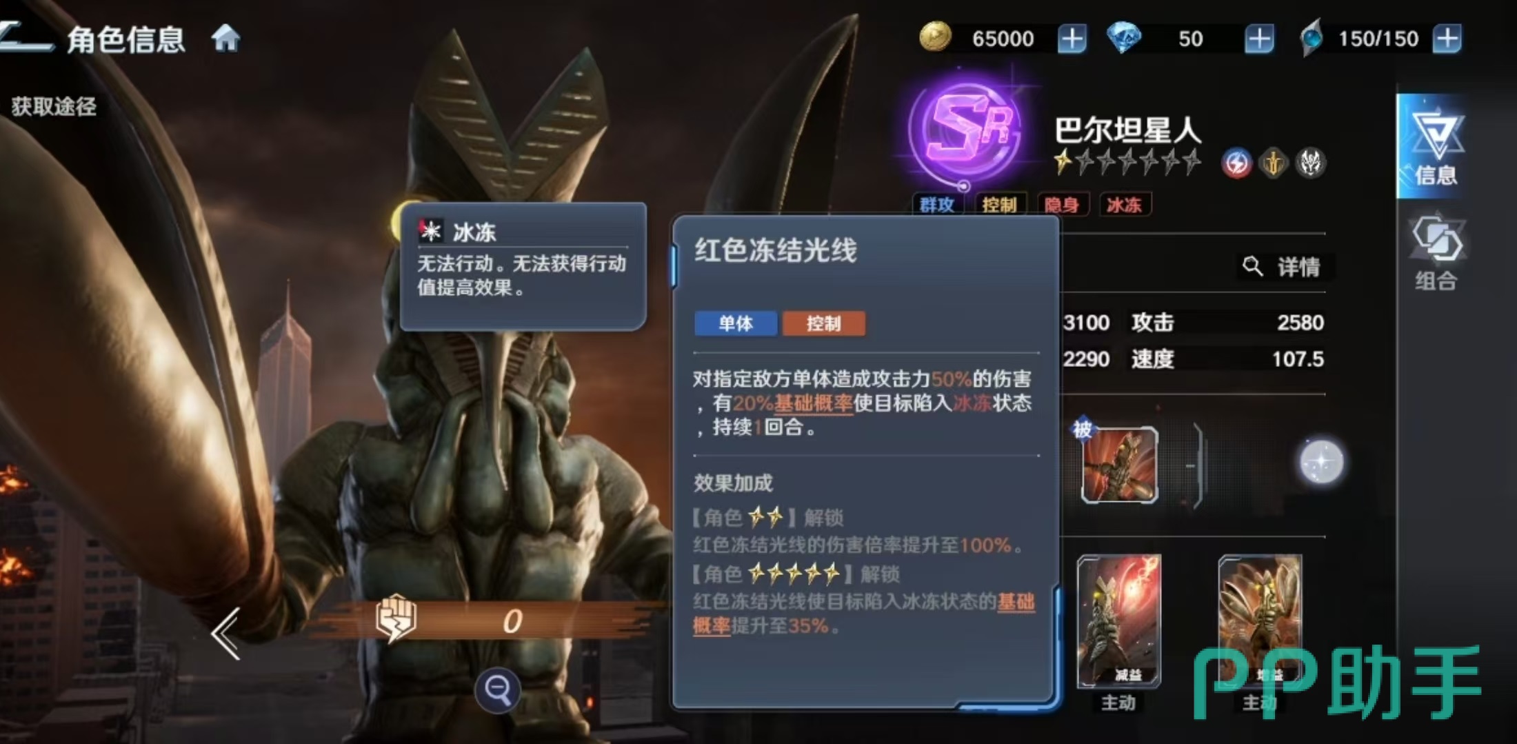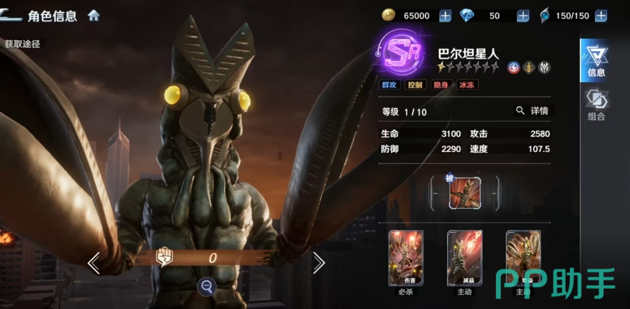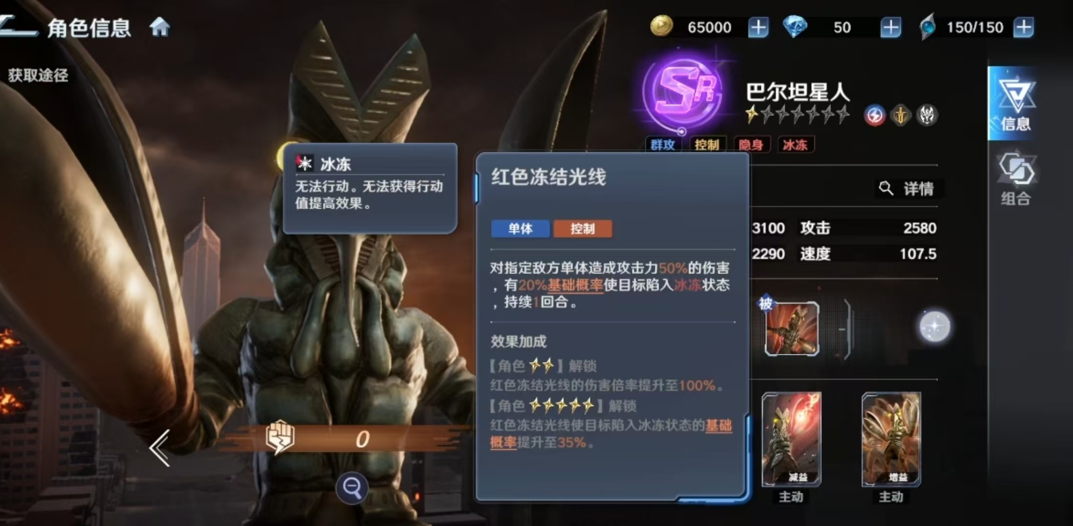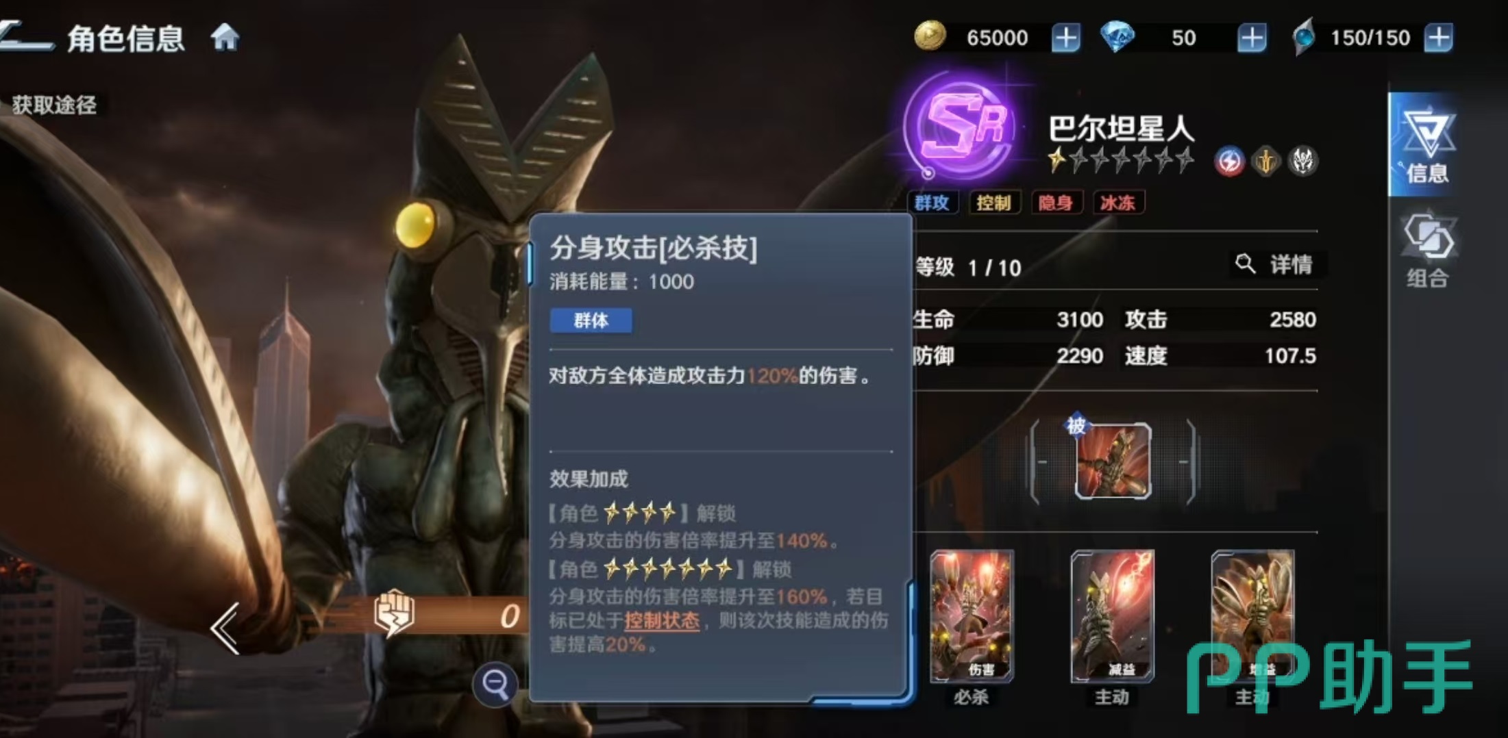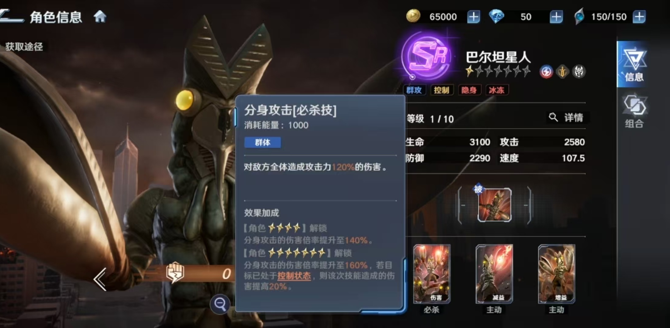 其被动技能提供全局减伤支持:当巴尔坦星人在场时,所有处于隐身状态的我方单位所受伤害降低15%。必杀技“分身攻击”对敌方全体造成120%攻击力的伤害,升星后倍率提升至160%,若目标当前处于控制状态,则额外触发伤害加成。主动技能“红色冻结光线”针对单体目标施加伤害,并附带冰冻效果,初始概率随星级提升最高可达35%,被冰冻单位将跳过下一回合行动。专属技能“隐身”可指定一名友方单位,使自身与该目标共同进入隐身状态,持续两回合;隐身期间不可被选中,且升星后进一步降低所受伤害。