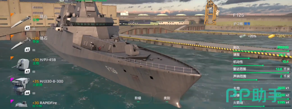 F126型护卫舰则以其强大的火力输出而闻名,它所配备的火箭炮在战斗中展现出了一定的威力,可以在输出的时候利用多炮火攻击的优势给对手造成压力,当与A22型火箭相互搭配时,其在近战场景下的表现更是得到很大提升,能够对靠近的敌人展开连续的火力打击,此外该舰自身还拥有较高的血量上限,在激烈的交火中能够承受住敌人的多次攻击,正因如此,如果玩家想要采取近距离冲锋突击的战术打法,F126型护卫舰是最为合适的选择。