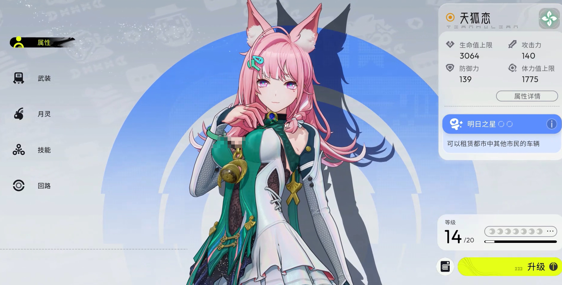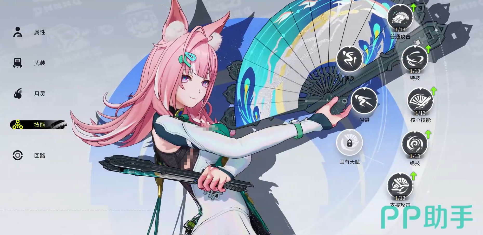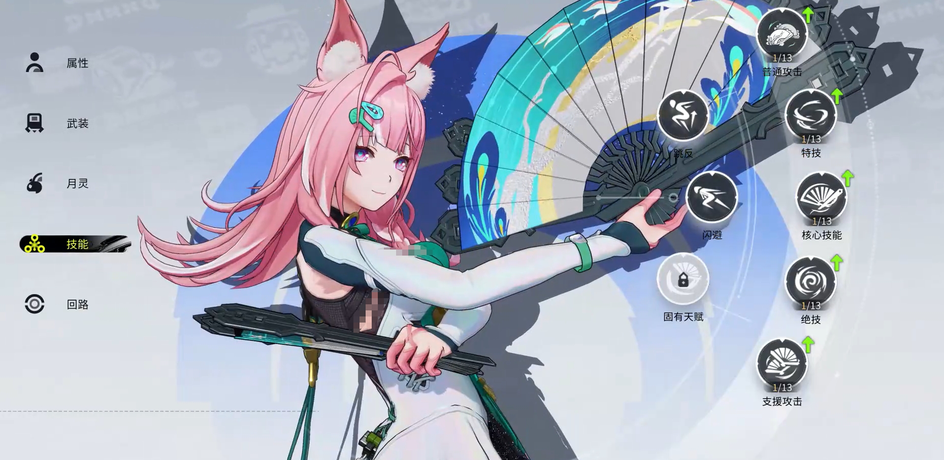 当充能满时能让天狐恋进入演出效果的特定状态中,提升其自身的普攻输出倍率,并生成两把围绕自己旋转的应援扇,它们能持续地对敌人造成伤害。若是在演出效果的状态下释放特技,天狐恋还能消耗所有人气值,为特技提升本次伤害的总伤害倍率。因此快速用普攻和特技叠出演出状态打出高额爆发,是天狐恋主要的输出方式。