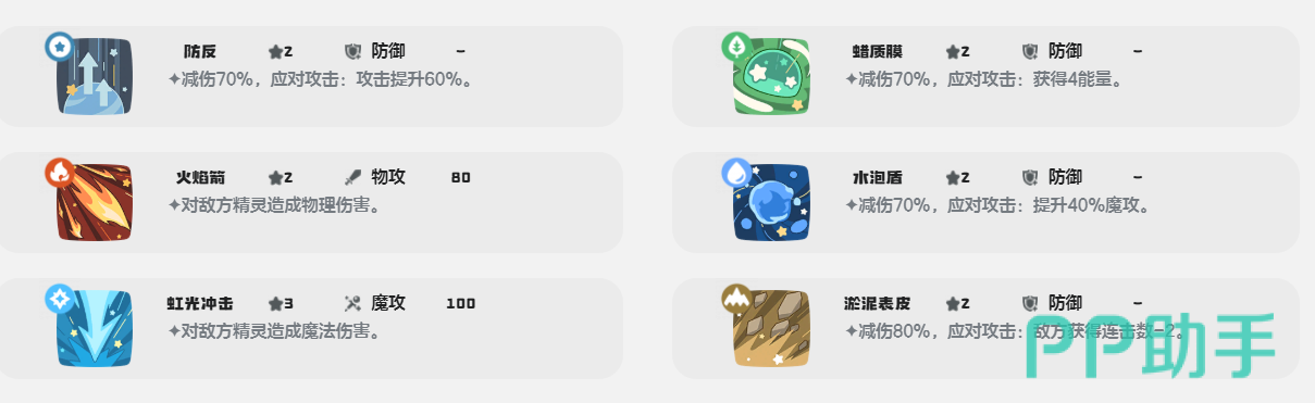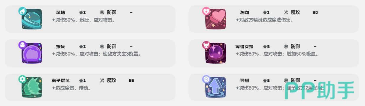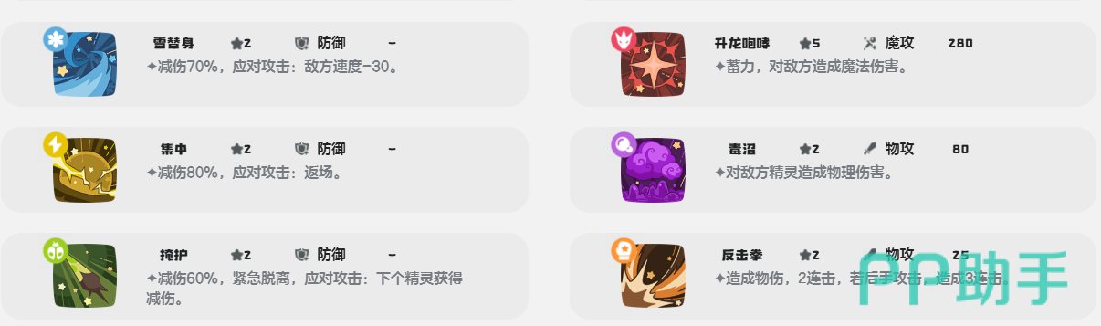 毒沼可以对敌方精灵造成物理伤害的同时施加毒素的影响,而掩护效果也可以减伤60%,并为下一个登场的精灵提供减伤庇护,反击拳可以造成物理伤害且2连击起步,若处于后手攻击位置,更是可以打出3连击的精彩操作,风墙主要是减伤50%,报复技能是带来减伤80%的同时,还可可以应对攻击时让敌方损失3点能量,削弱其战斗能力,等价交换这个技能在减伤80%之后,应对攻击时增加50%吸血效果,维持自身血量健康,还有离子震荡造成魔伤并将伤害传导给周边单位,冥想的效果是减伤80%,应对攻击时赋予敌方2层星陨负面状态。