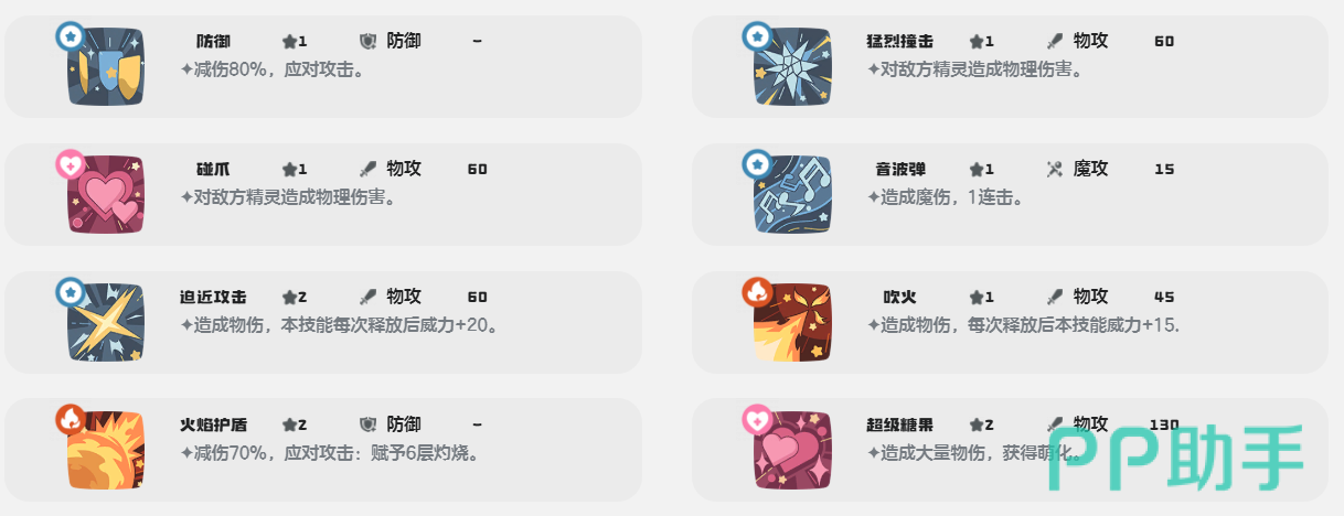 其独特特性仁心,当它萌化之时,能够驱散己方全体成员所承受的所有减益效果,抵御负面状态,再看它丰富多样的精灵技能当中基础技能火苗,释放时向敌人造成实实在在的物理伤害,同时自身还能积攒1点能量,为后续技能蓄力,拍击则是挥舞着小爪子,汇聚魔力对敌方精灵打出强劲的魔法伤害,防御则是会在身躯周围立刻浮现出一层淡淡的红色光晕,可减免高达80%的伤害,猛烈撞击更是给对手带来沉重的物理打击,还有碰爪也不逊色,可以在输出之后再次给敌方造成可观的物理创伤。
