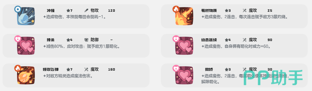 随着战斗深入,进阶技能逐一解锁,比如音波弹造成魔法伤害并实现1连击,迫近攻击越战越勇,每次释放后威力自动提升20,吹火技能的效果是带来的火焰随风而涨,每次施展后该技能威力增加15,火焰护盾使用的时候不仅削减70%所受伤害,还赋予自身6层灼烧效果,让靠近的敌人也受到火焰炙烤的影响,还有超级糖果会抛出缤纷糖果引发大量物理伤害,同时使自身进入萌化状态。