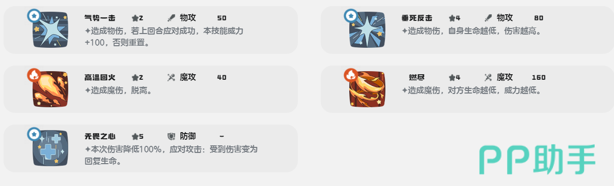 还有很多辅助与控制技能,高温回火技能可以以高温灼烧敌人,造成魔法伤害后脱离战场,燃尽这个技能的效果虽对方生命越低威力越弱,却也能在收尾阶段稳定输出;无畏之心会让本次承受伤害降低100%,转而将受到的伤害转化为生命回复,化险为夷,防反技能可以在减伤70%的同时应对攻击还能提升60%攻击力,蜡质膜这个技能是可以同样减伤70%,并在应对攻击时获取4点能量,强化后续行动。