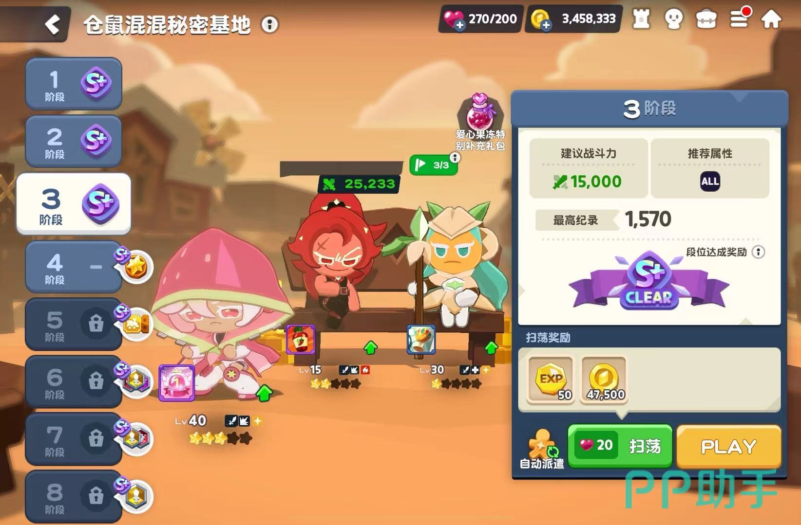 另一座经验获取主力副本为仓鼠混混秘密基地,同样划分为8个难度层级,各阶段设有推荐战力与属性倾向提示。其奖励结构侧重经验与金币双轨产出:第1阶段可获30点经验与22000金币;第8阶段则提升至160点经验与135000金币。该副本采用限时清剿机制——玩家需在限定时间内尽可能击败更多仓鼠系小怪,系统依据击杀总数进行评级(最高为S+),评级越高,经验与金币奖励越丰厚。