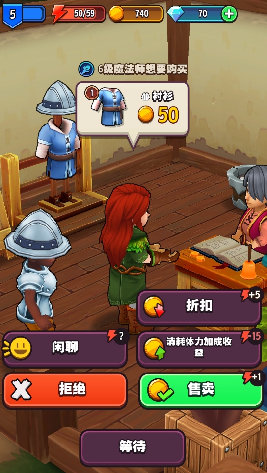 在进行装备售卖时,各位也能通过加价的方式,来令自己的单次交易获得更高的回报。每次提价的效果都比较夸张,也是游戏里积累金块的常用手段之一,但需要耗费体力,体力不足时可通过给客人打折来进行回复。