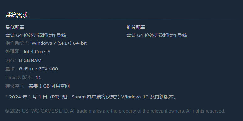 可以看到页面的配置信息中,最低版本的操作系统只需要window7以上,处理器也是酷睿5系的低端路线,甚至显卡只需要GTX 460以上即可,1GB以内的包体大小,可以说基本上市面上所有主流设备都可以承载这款游戏的流畅运行。