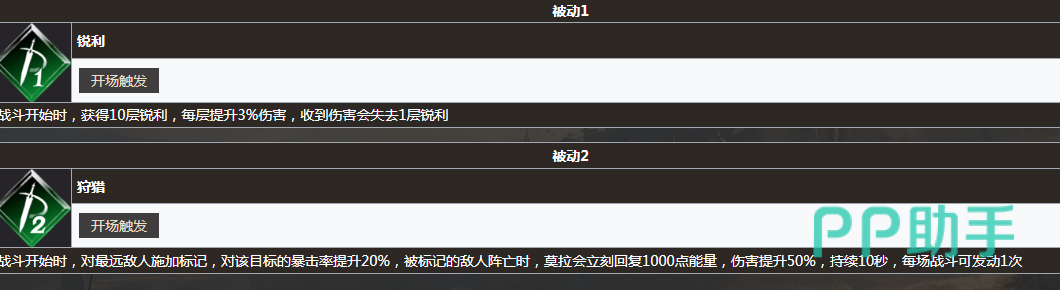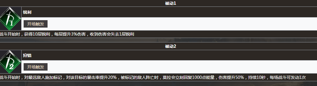 两个被动技能为莫拉的持续输出提供了强力支撑。锐利被动在战斗开始时立即生效,赋予角色10层锐利状态,每层提升3%伤害,但每次受到攻击将失去一层。这一机制鼓励玩家为其创造安全的输出环境,层数维持越久,整体输出越稳定。第二个被动狩猎则专注于开局爆发,可在战斗初始提供20%暴击率和50%伤害加成,但每场战斗仅能触发一次。合理利用此技能,可在战斗初期迅速建立输出优势。