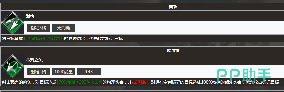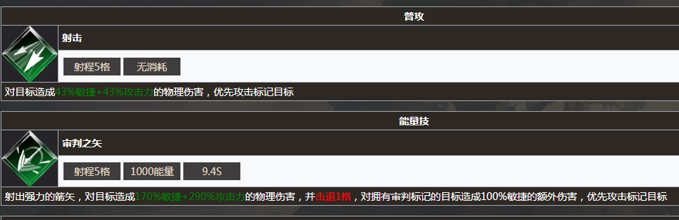 审判之矢是莫拉的核心能量技,也是其主要输出来源。释放后可对目标造成高达290%的攻击力伤害,并附加170%的敏捷伤害,同时产生一格距离的击退效果。若目标身负审判标记,则额外承受100%敏捷值对应的伤害。此外,该技能同样遵循标记优先原则,确保高威胁目标被第一时间处理,极大提升了连招衔接与伤害循环效率,无论是单体斩杀还是控制衔接都具有显著优势。