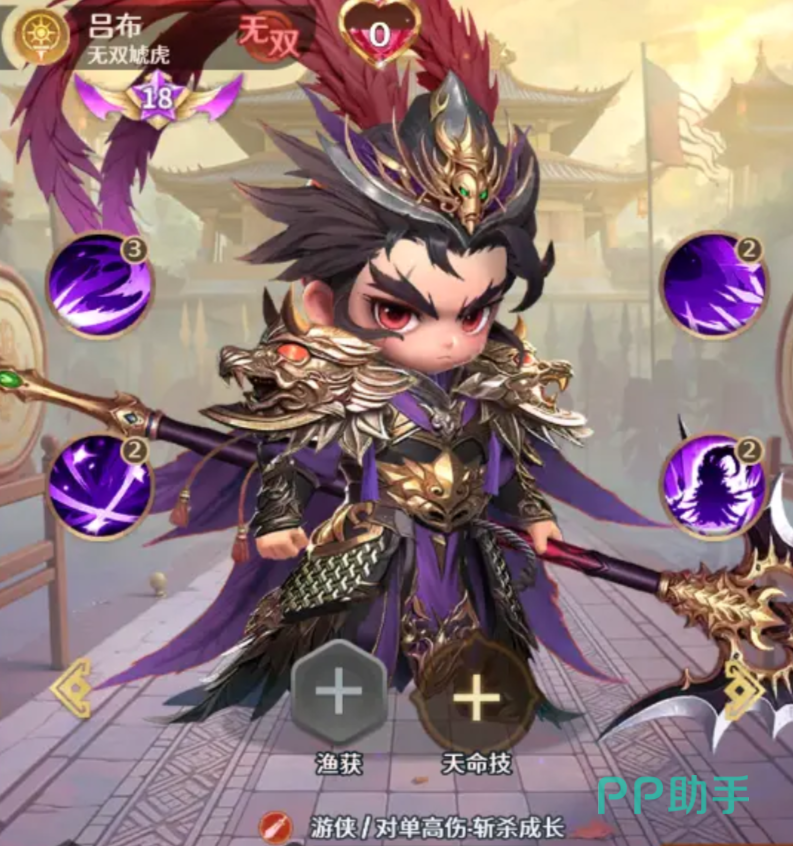 格斗三国志魔邸吕布以超凡臂力与精湛骑射技艺著称,凭借极致单体爆发与战中成长机制成为高人气核心武将。其技能组合兼具群体压制、斩杀补刀与持续增益能力,实战定位鲜明。以下为深度解析其技能机制、数值表现与阵容协同逻辑,助玩家高效掌握这位“飞将”的战术价值。