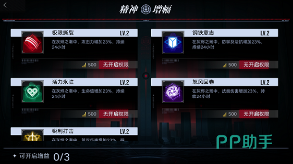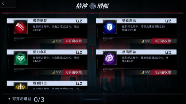 增益的实际效果受秘盟等级直接影响:等级越高,各项加成数值越显著。例如,5级秘盟开启“狂怒增幅”增益可提供+12%暴击伤害,而8级秘盟同增益则提升至+21%。因此,日常积极参与秘盟建设类活动(如秘盟任务、资源捐献、联合讨伐等),持续提升秘盟等级,是增强灰烬之潮整体表现的重要前置条件。每项增益持续时间为24小时,且同一时段最多叠加3种不同类型的增益。建议根据当日挑战目标(如侧重清场速度、Boss压制或生存续航)由管理层统筹决策开启组合,避免资源浪费或增益冲突。