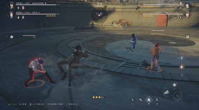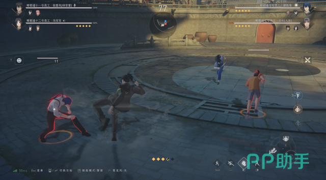 玩法结构采用2v2同屏对战形式,四名玩家同时进入战场,每人携带三位异人角色轮流上阵。双方队伍的角色选择互不可见,内部则可互相查看,避免重复。战斗中敌我辨识清晰,敌方角色周身标注红色光效,配合小地图的实时位置提示,使得战场信息极为直观,无需额外判断即可快速切换战术方向。