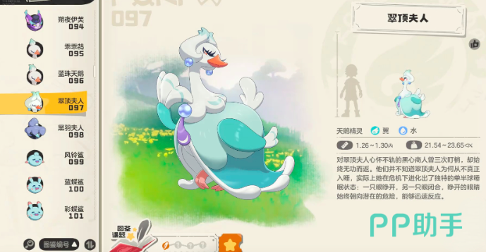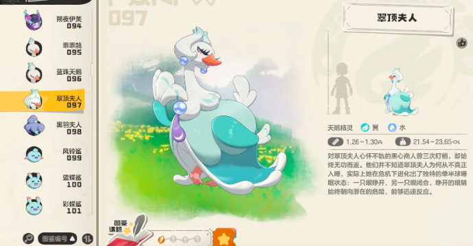 要想获取这个角色,方法还是非常简单的,玩家需要先捉住乖乖鹄,但其升星进阶后可以获得兰珠天鹅,等到兰珠天鹅升至32级后,就可以解锁翠顶夫人了,乖乖鹄的捕捉地是在风眠省的隐秘滩涂附近,这个角色的物防表现非常出众,种族值高达396,几乎没有天敌,在受到威胁时,可以退回水中,躲避陆地上的敌人,是属于水系精灵。