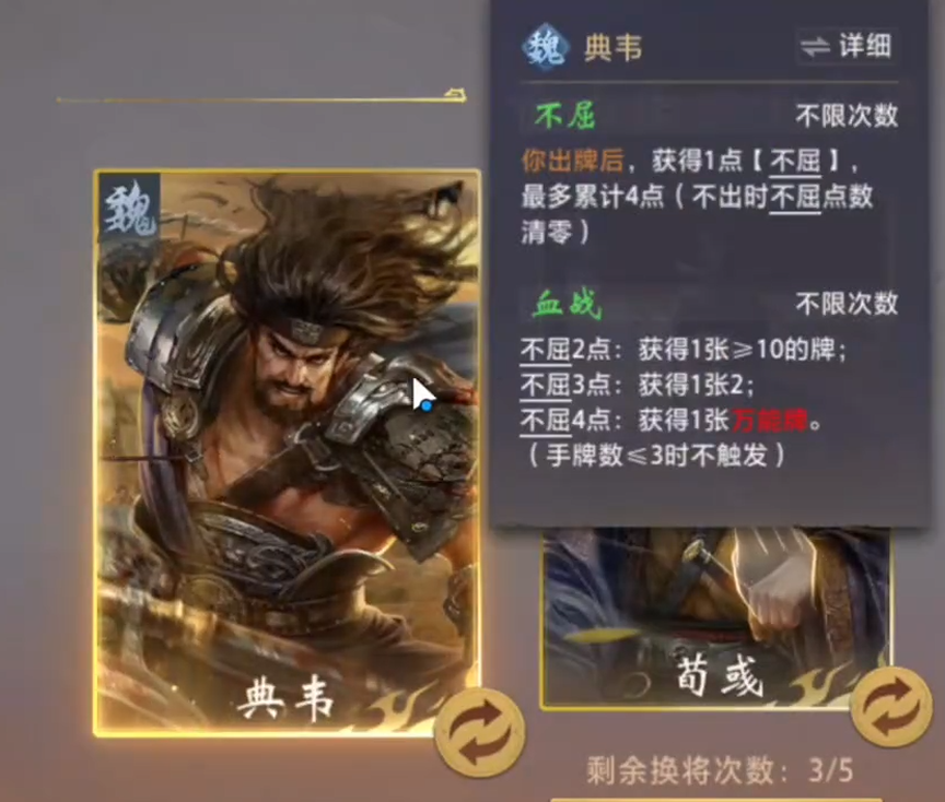 典韦的首个核心机制为“不屈”:每成功打出一张手牌,即累积1点不屈值,上限为4点。该数值不具备跨回合保留特性——若某回合未进行任何出牌操作,所有已积累的不屈点数将即时清零。这一设定倒逼玩家建立主动进攻意识与连贯行动逻辑,使典韦成为典型“越打越强”的节奏型武将,对局掌控力随出牌频率线性提升。