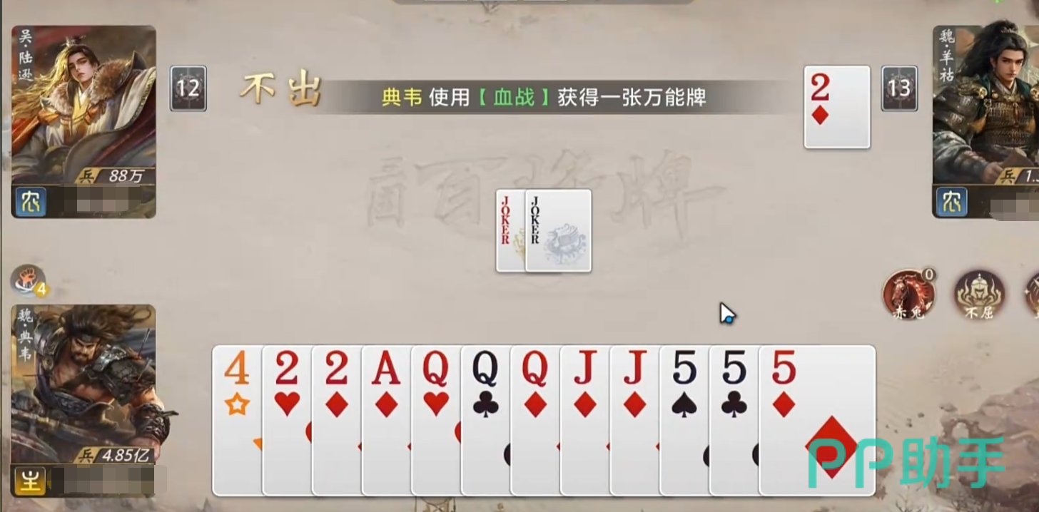 不屈值升至3点后,“血战”升级为确定性增益:立即获得一张【2】。在《三国百将牌》牌型规则中,【2】具备最高单牌压制力,可覆盖除炸弹外的所有单张及部分组合,是扭转出牌权、打断对手节奏的核心工具。此时典韦已具备中期主导能力,配合稳定输出节奏,可逐步确立场面优势。