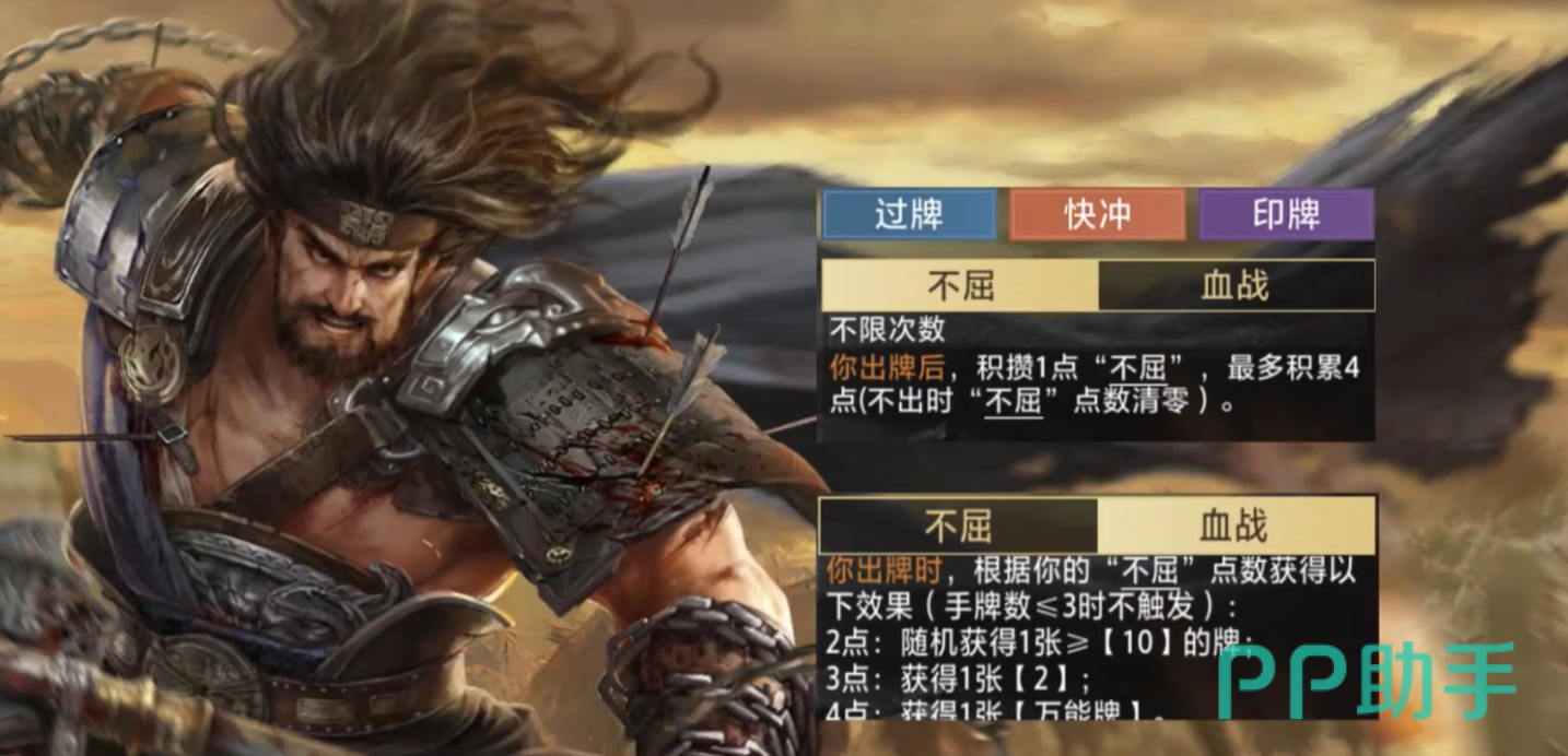 当不屈值达到2点时,“血战”效果首次激活:系统随机赋予一张点数≥10的牌(如J、Q、K、A或2),显著提升高权重单牌获取概率,为后续压制性出牌储备关键资源。需注意,该效果仅在当前手牌数>3张时生效,因此合理控牌是触发进阶收益的前提条件。