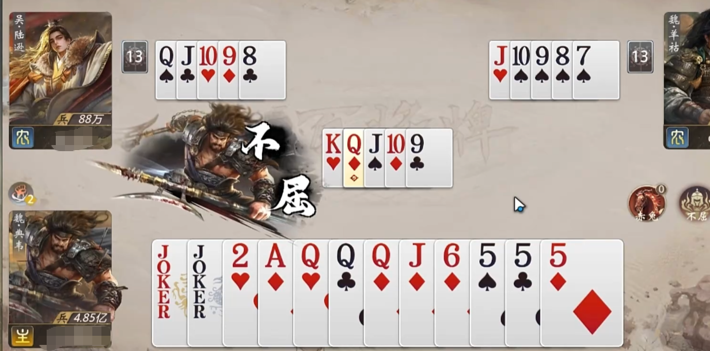当不屈值满格至4点,“血战”触发终极效果:获得一张万能牌。该牌可自由定义为任意点数与花色,在组顺子、凑对子、补缺牌型等场景中具备极高适配性。尤其在残局阶段,万能牌能快速填补出牌缺口,加速收束进程,大幅提升战术容错率与策略弹性。
