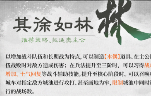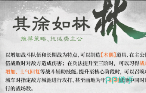 【其徐如林】侧重控场与反制,以战车体系为核心构建牵制链:通过木偶道具制造伪目标干扰敌方判断;队伍溃败时触发高额反伤效果;随兵法等级提升,逐步解锁战功加成、士气恢复及攻城车召唤等关键能力;特色技能“画地为牢”可压缩敌方有效作战城池数量,限制其兵力展开空间。