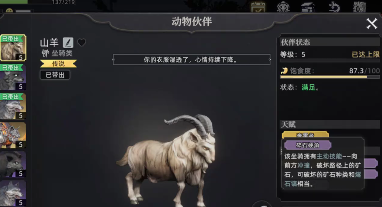 同时,紫色品质的山羊不具备有任何的耐久性,玩家只需要定期的喂食,即可协助玩家开矿,不止如此,山羊作为坐骑使用时,前往雪山区域内,移动速度会增加5%,同时,母山羊可以拔取羊毛,并且还能够制作羊肉,羊肉也是游戏内重要的御寒食物。