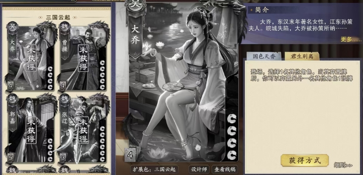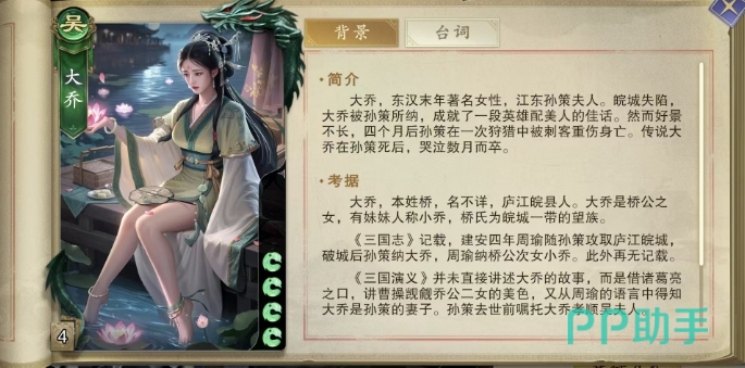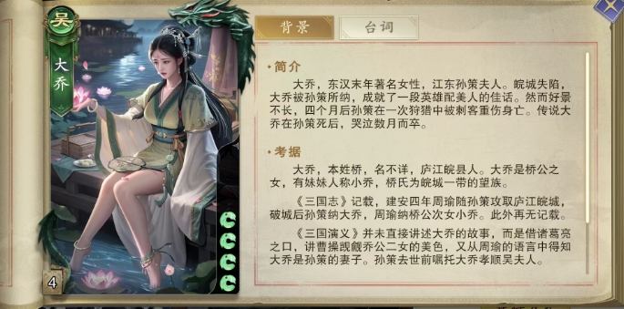 在代号杀的武将阵容中,其实目前因为都是以卡牌的形式出现,所以很多女性武将会比有立体角色展现的时候,更容易被大家忽略,其实这里的大乔也是战场上不可多得的策略大师,代号杀大乔怎么样就作为东汉末年江东孙策的夫人来看,大乔不仅拥有倾国倾城之貌,在游戏中更是带有一定的牵制技能。