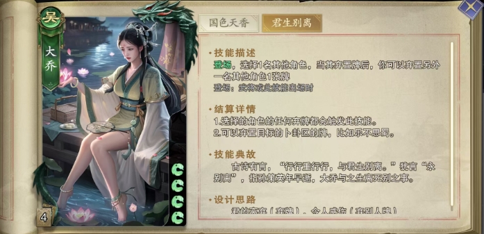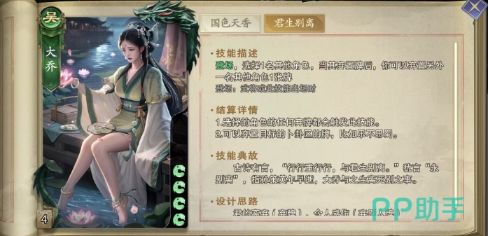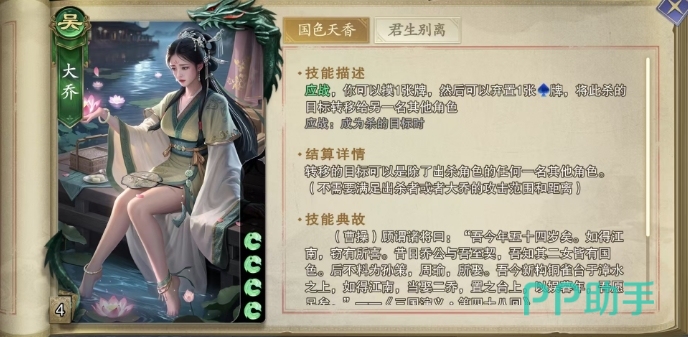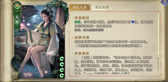 她初始拥有4格体力值,核心技能国色天香,每当应战之时,大乔便能发动此技能,先是摸取一张牌,随后她可以巧妙地弃置一张手中的牌,并将原本指向自己的杀转移给另一名其他角色,这一转移过程极为灵活,目标可以是除了出杀角色之外的任何一名角色,完全不受出杀者或大乔自身的攻击范围与距离限制,这意味着,大乔可以在瞬息之间改变对面出牌的局势。