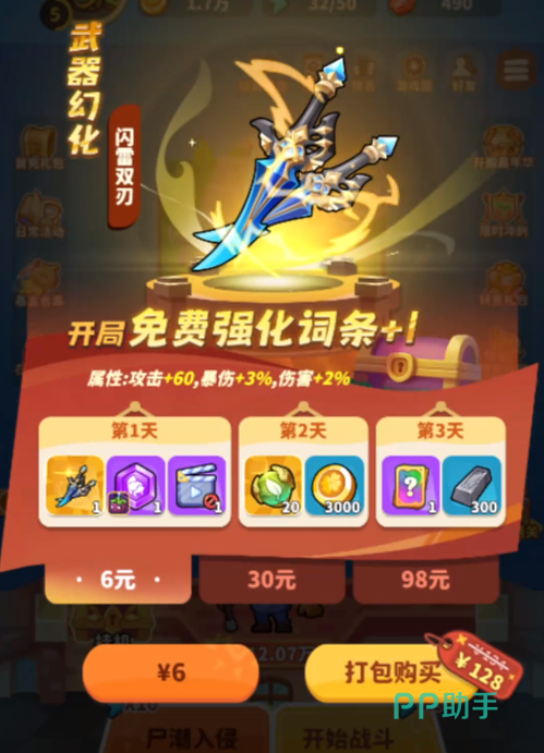 在角色强化体系中,植物不仅拥有基础技能,还可装备专属幻化武器以增强实战能力。“闪雷双刃”即为其中一款高人气可购武器,提供三档定价方案:入门档仅需6元,购买后可连续3天领取指定奖励,并同步提升全队攻击数值与暴击伤害倍率。该设定特别适合中期战力爬升阶段的玩家,用较低成本实现属性跃迁。