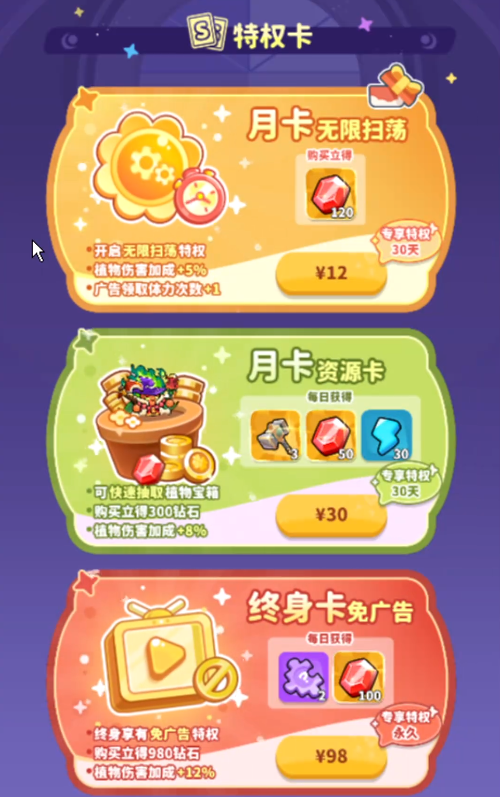 月卡系统是游戏中使用频率最高的付费模块。基础月卡售价12元,生效期30天,权益包含每日无限次关卡扫荡权限、角色伤害加成以及总计120枚宝石;进阶月卡定价30元,同样覆盖30天周期,除更高幅度的战力增益外,还额外开放快速抽取植物宝箱功能,大幅提升稀有单位获取效率。此外,终身免广告服务标价98元,购买后永久屏蔽全部广告干扰,并一次性发放980钻石,同时附带角色伤害提升效果,属长期投入型高性价比选项。