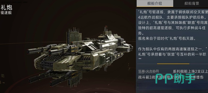 礼炮的舰种归类为驱逐舰,主攻方向为中近距离实弹压制。其机制优势在于多弹种兼容性——可同时搭载穿甲弹、高爆弹及特殊制导弹药,并支持模块化升级以强化“能爆”属性(即能量爆发伤害加成)。建议优先提升弹药装填效率与单发实弹伤害,再逐步堆叠命中率与射速。在编队协同方面,推荐搭配“彼得大帝”或“联盟”等具备高基础火力与战术支援能力的主力舰。当队伍中同系列驱逐舰达到2艘及以上时,将在战斗第二阶段触发专属战术效果:全队实弹类技能伤害提升10%,该增益对高护甲目标具有显著破防价值。
