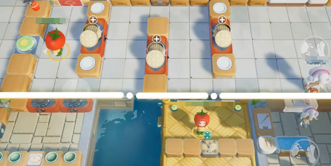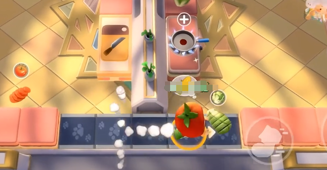 当关卡地图直接被分成两个不同区域时,鲜嫩的牛排和煎锅中间就会隔一个间隔,那在此时玩家就可以选择投掷技能。只需要按住屏幕,根据食材的重量,然后去调整抛物线的角度,在松手的一瞬间,食物就会直接掉落到锅。这一个操作还是比较简单的,例如可以把左侧切好的番茄直接放到右侧的汤里面,中间虽然会有将近三米宽的料理台,但只要蓄力瞄准,那自然就可以直接触发完美连击的功效。