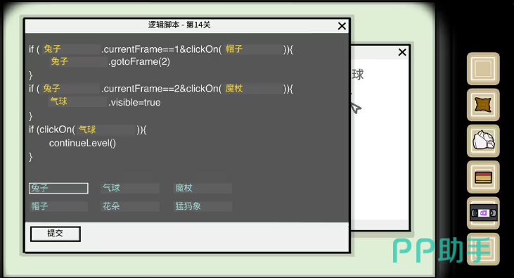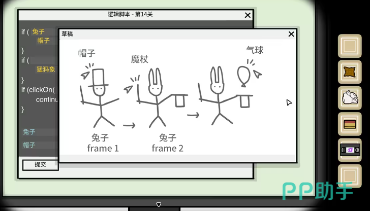 当剧情推进到这里时,小伙伴们可以看到右边的npc在向你招手,并邀请你帮他修复bug。玩家们点击他身边的显示器,即可看到在屏幕上出现了逻辑脚本的字样,同时还出现了一篇草稿,而这篇草稿中所包含的内容就是玩家们完成这一部分的关键了。首先.currentFrame判断的是当前的frame id,所以在这个空格中,玩家们能填入的只能是兔子。