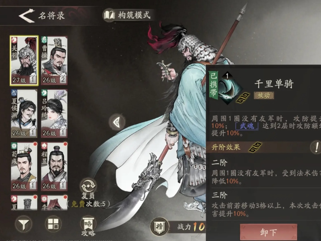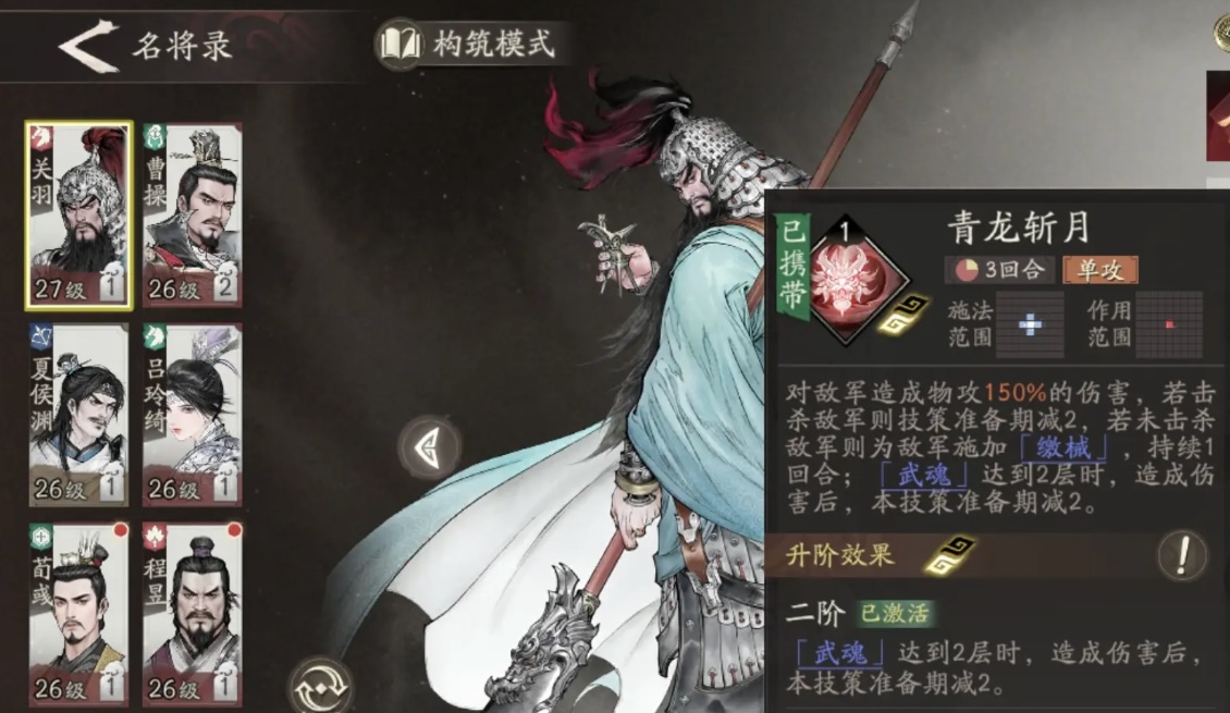 当关羽升至五星阶段时,武魂上限提升至三层,并附加额外伤害效果,尤其对高生命值目标具备更强的打击能力。达到十级后,初始即自带两层武魂,在战斗初期便能发挥出色的爆发力。其核心输出技能“青龙”可对敌方造成50%的物理伤害,配合多段技能联动与命格系统带来的属性强化,整体作战强度大幅提升。
