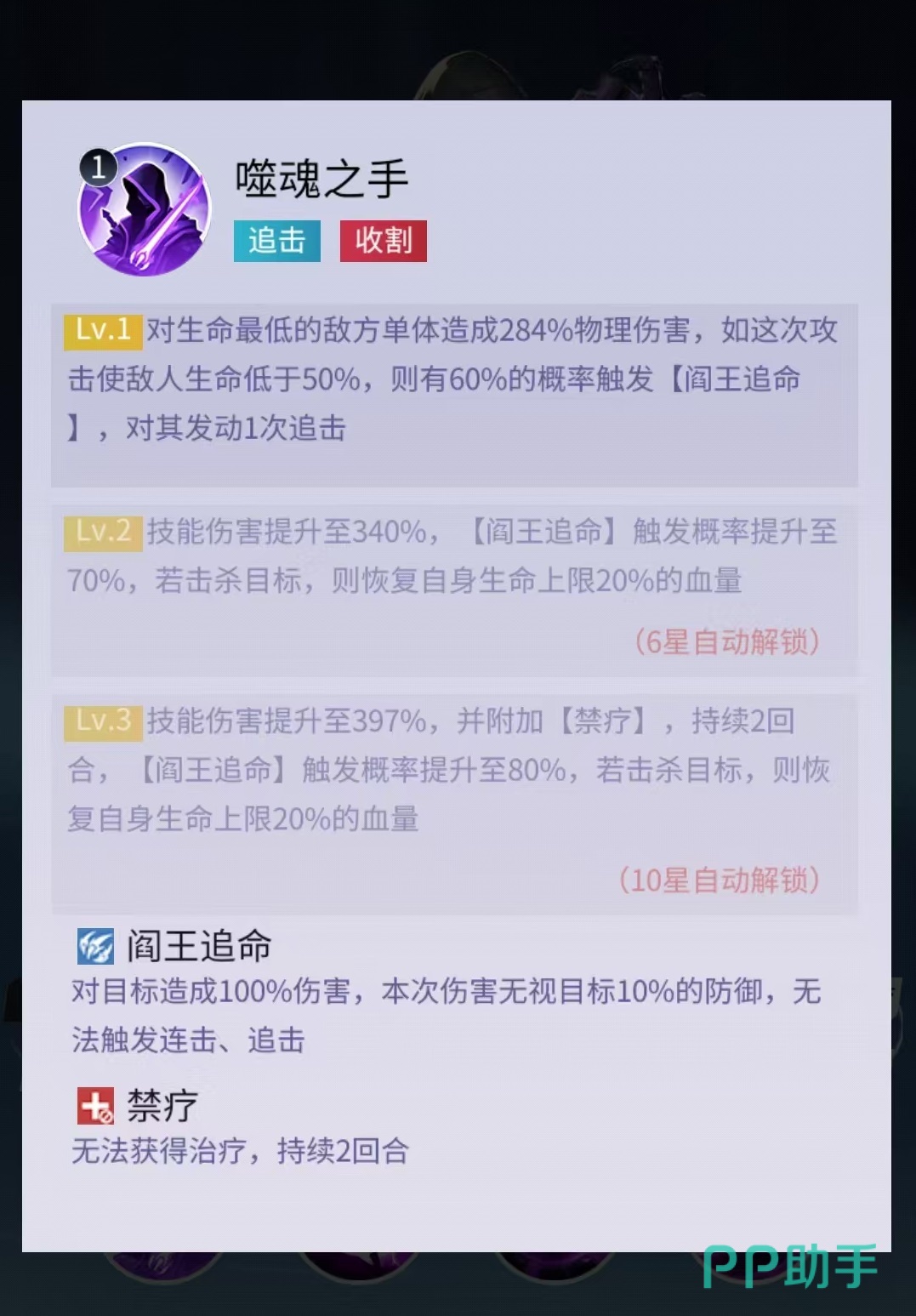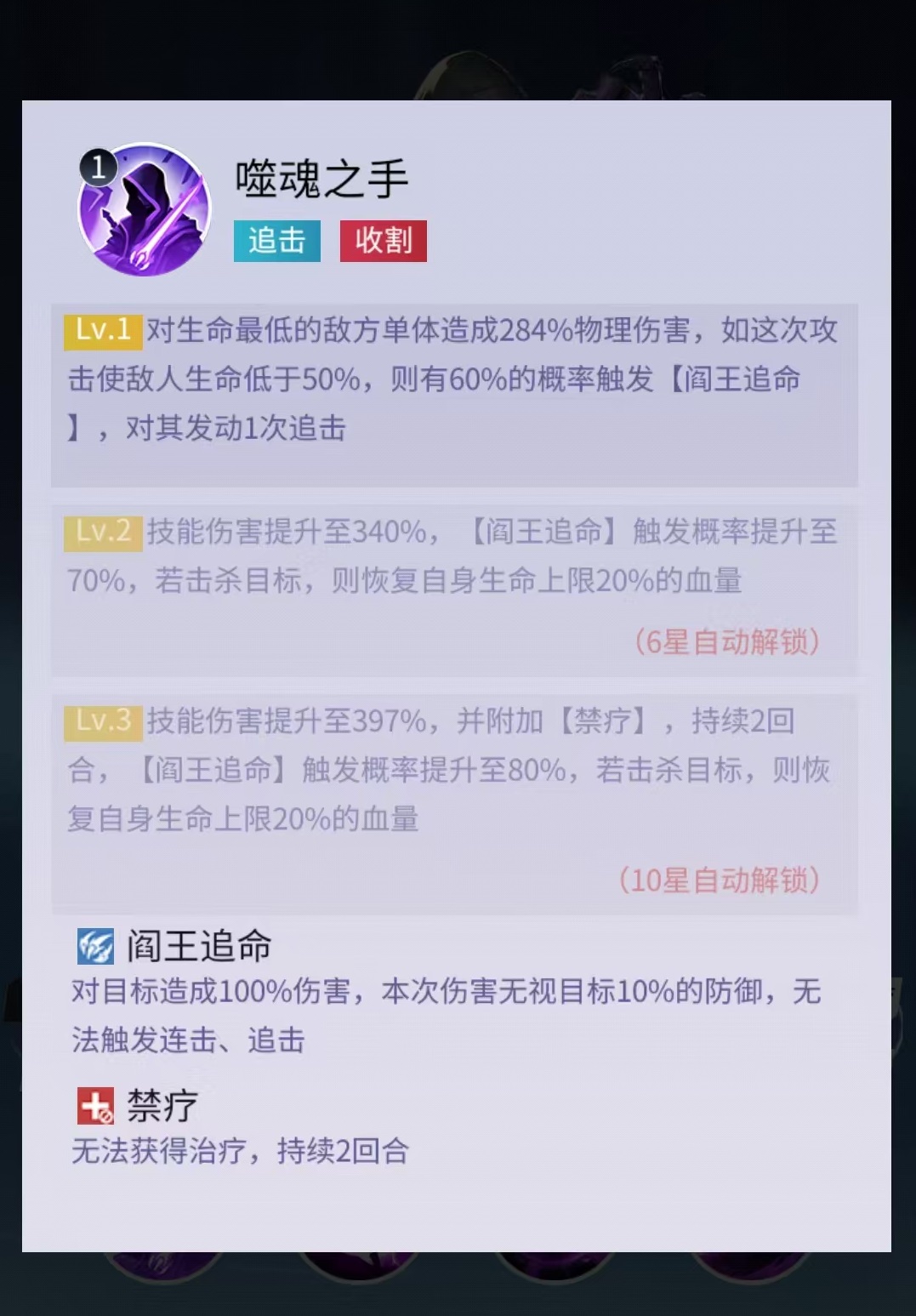 从整体输出模型来看,阎罗王并非传统爆发型DPS,其真正价值体现在多段追击的战术延展性与战场控制力上。随着一技能等级提升,将额外附加“禁疗”效果,使目标在接下来两回合内无法恢复生命值。该效果直接作用于血量最低单位,极大压缩敌方残血反打空间,是针对续航流、治疗队的核心反制手段。