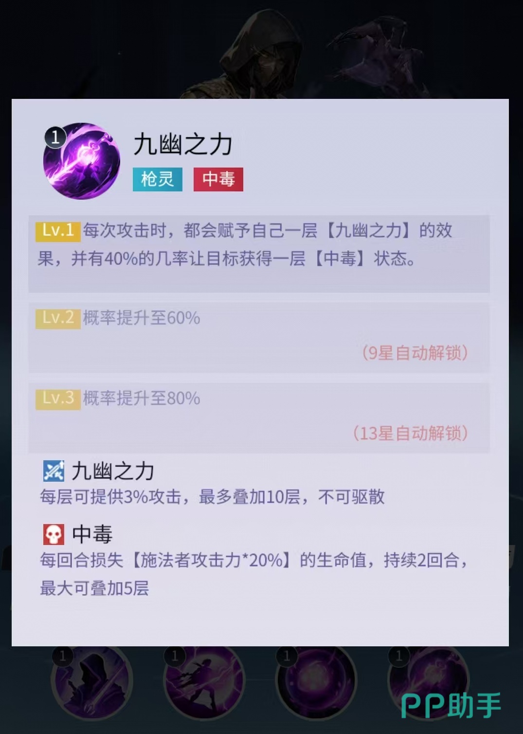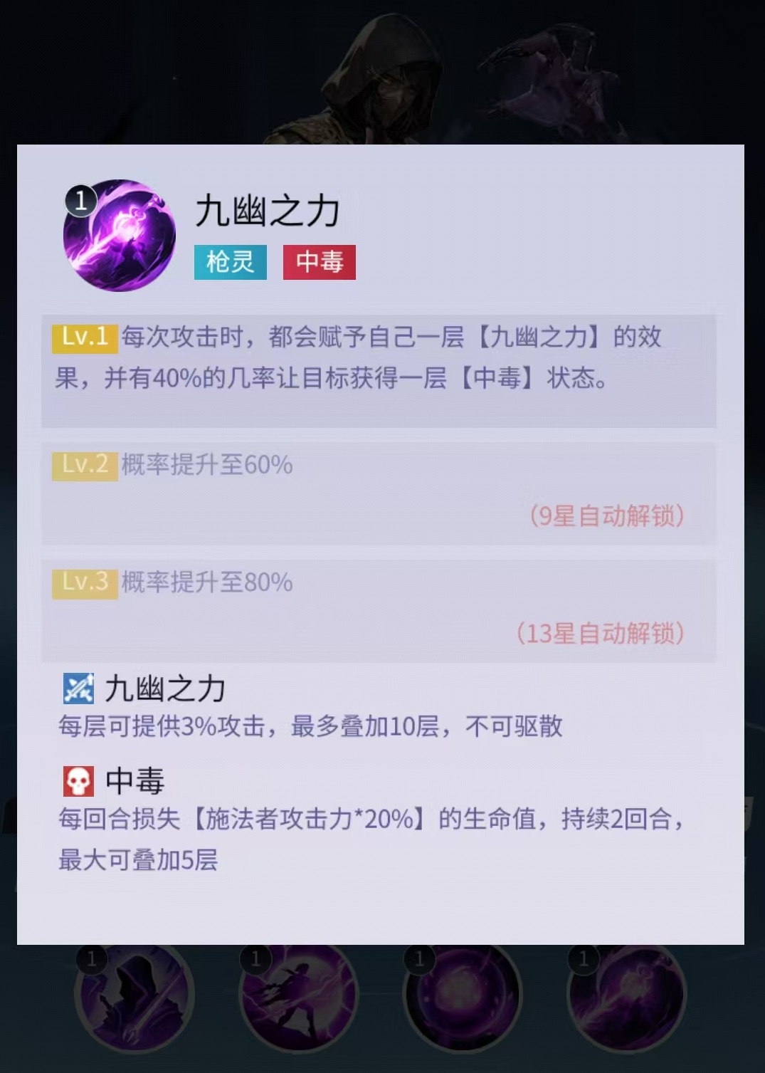 二技能具备协同作战特性:当任意我方单位完成普攻后,阎罗王将随机对被攻击目标释放一次【阎王追命】(效果同上)。该机制高度依赖高频出手队友配合,推荐搭配多段攻击、多动次或拥有“再动”“增攻”类辅助的伙伴,以最大化追击覆盖率。三技能为被动增益,永久提升自身攻击力、最大生命值及暴击伤害。终极技能【九幽之力】则赋予持续成长属性——每次普攻叠加1层,每层提供3%攻击力加成(上限10层),同时有概率令目标陷入中毒状态,每回合持续损失生命值。