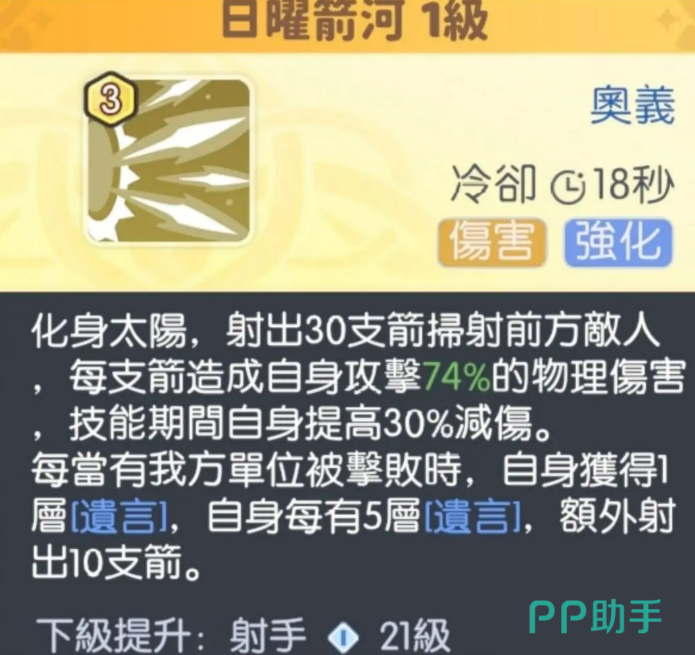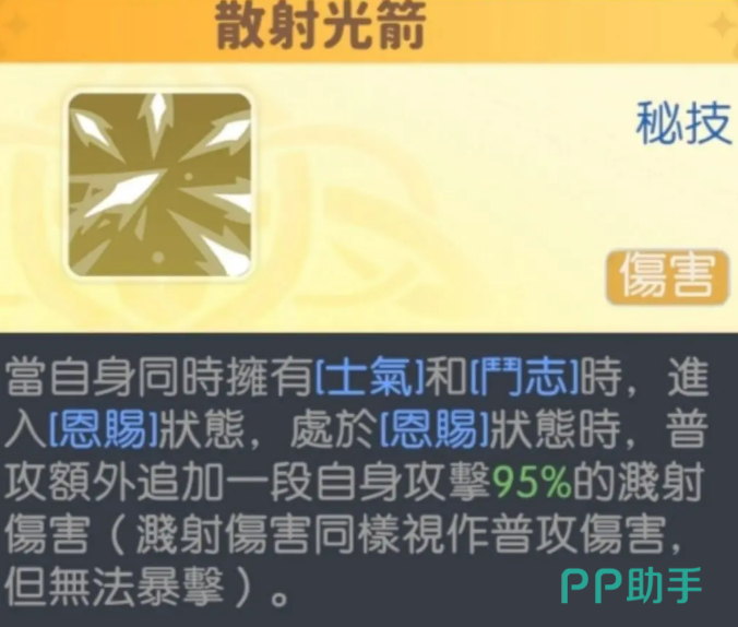 在特技方面,阿波罗的“散射光箭”能够在她同时拥有“士气”和“斗志”状态时,进入“恩赐”状态。在这个状态下,她的普通攻击将会额外追加一段溅射伤害,虽然无法暴击,但95%的攻击力溅射伤害可以大大提高她在群体战斗中的输出效率,帮助她快速清理敌方单位。
