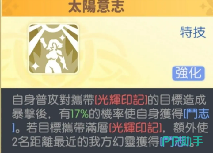 阿波罗的秘技“太阳意志”则赋予了她更强的战斗能力。当她的普通攻击对携带印记的敌人暴击时,有17%的几率获得“门志”状态。若敌人已经堆满了“光辉印记”,则阿波罗还能让两名最近的幻灵队友获得“门志”。这一技能不仅增强了阿波罗自身的战斗力,还能对队友提供有效的增益,为团队战斗提供更多的战略选择。
