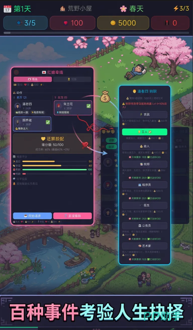 区别于传统模拟类游戏对资源数值的单一依赖,《躺平村物语》创新引入“行动力”系统——每位玩家每日仅拥有3点行动力,必须在打工赚钱、相亲恋爱、调解纠纷、休息减压四项核心行为中进行取舍。这一机制高度还原现实生活中的时间稀缺性与决策成本,每一次点击都意味着放弃其他可能性,让“选择”本身成为游戏叙事的重要驱动力。